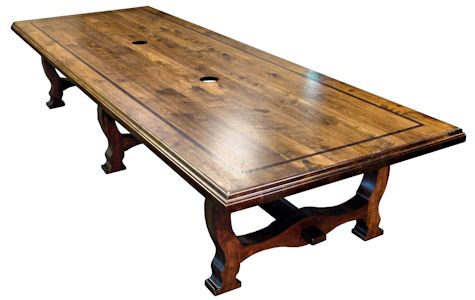 Distressed face grain Walnut trestle-style conference table with Wenge accents. Pop-up electrical grommet access. Through mortise and tenon jointery.