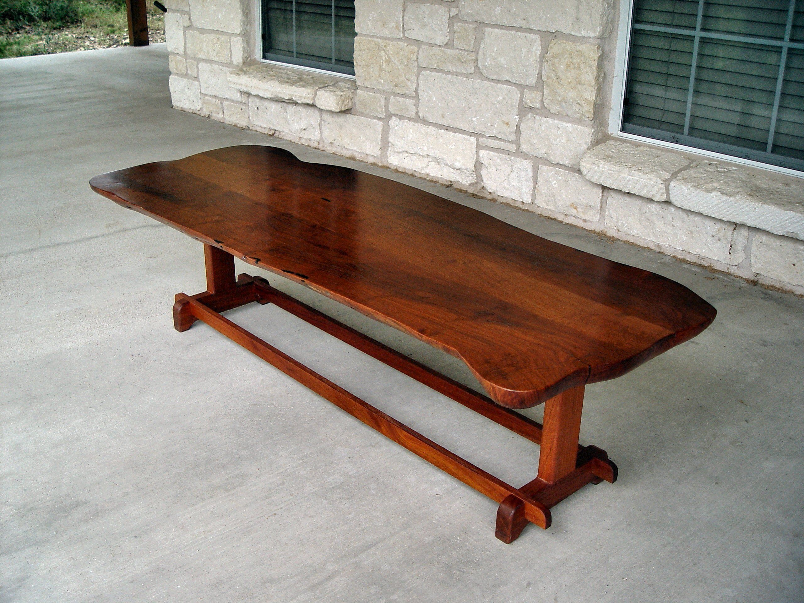 Custom face grain argentinean mesquite dining table. Rustic trestle-style construction with through mortise and tenon jointery and hand carved edges.