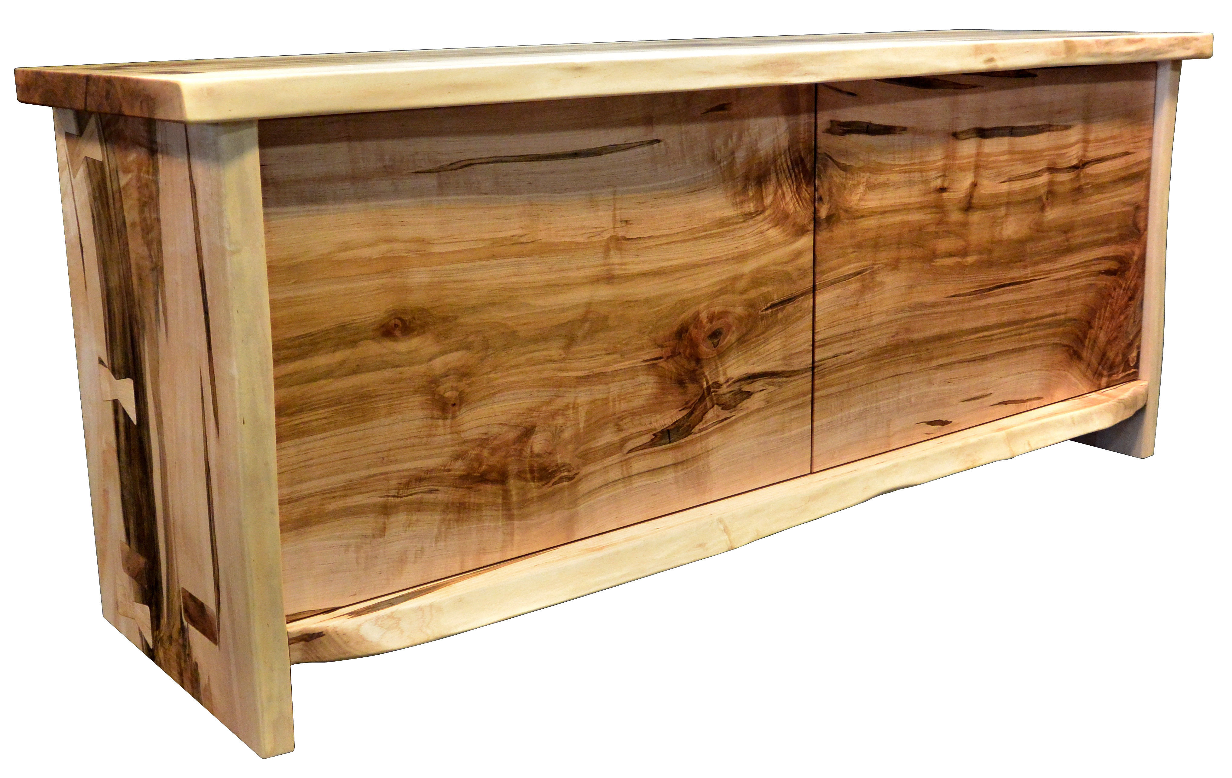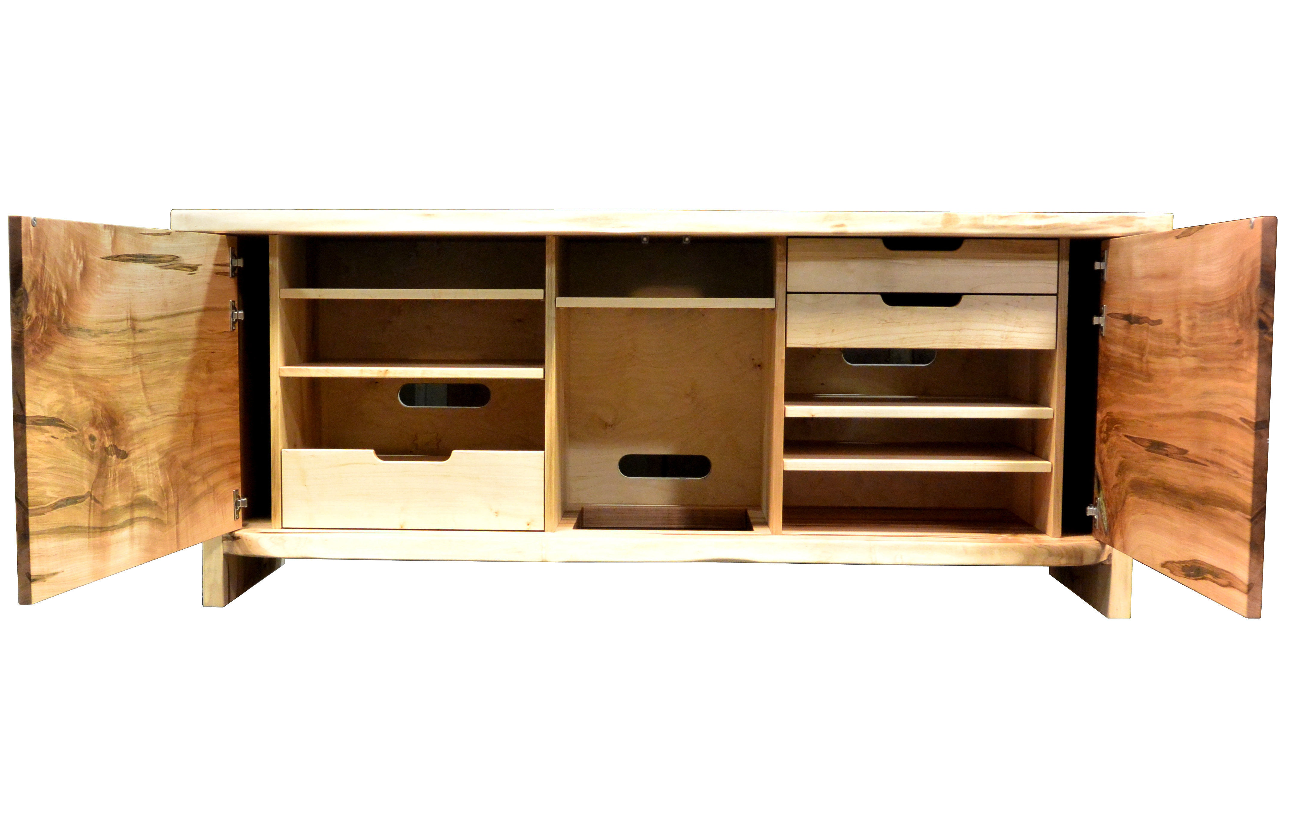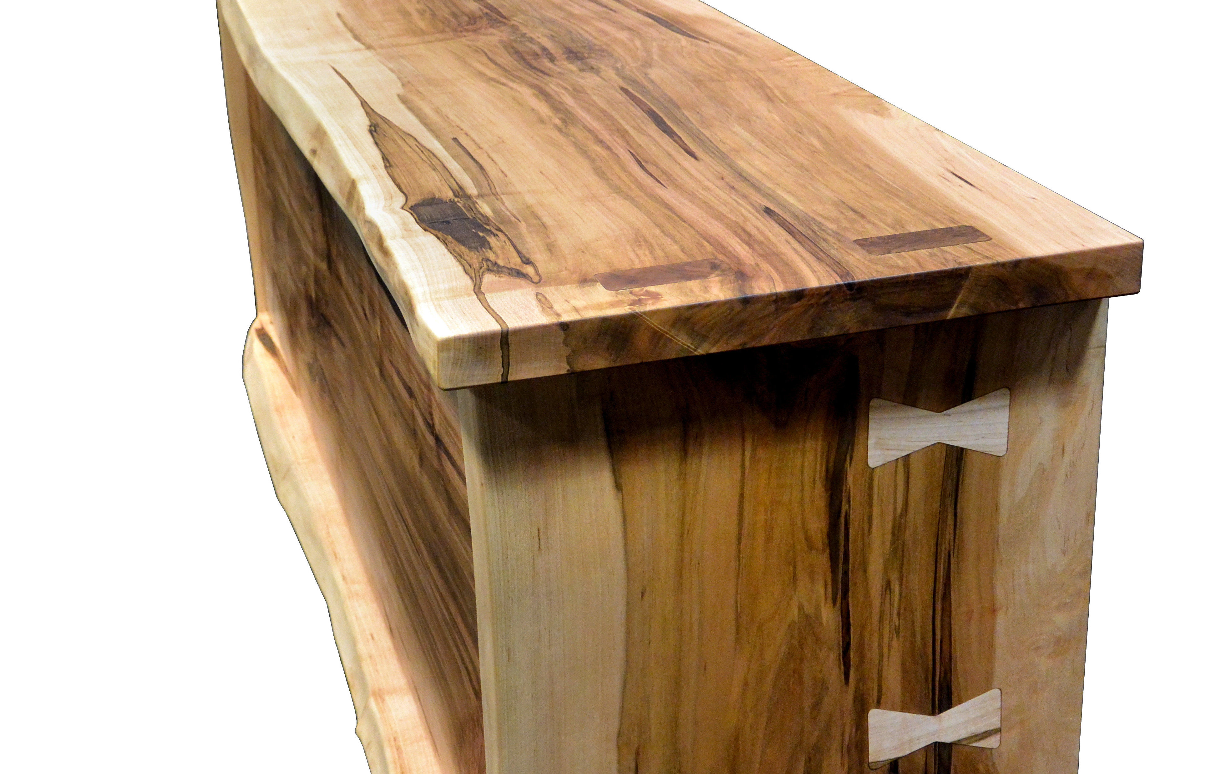 Custom Entertainment Center made from Ambrosia Maple Slabs. Natural Edges on Face. Mortise and Tenon Jointery. Maple Butterfly Detailing. Adjustable Shelves. Cord Cutouts. Tung Oil Citrus Finish.