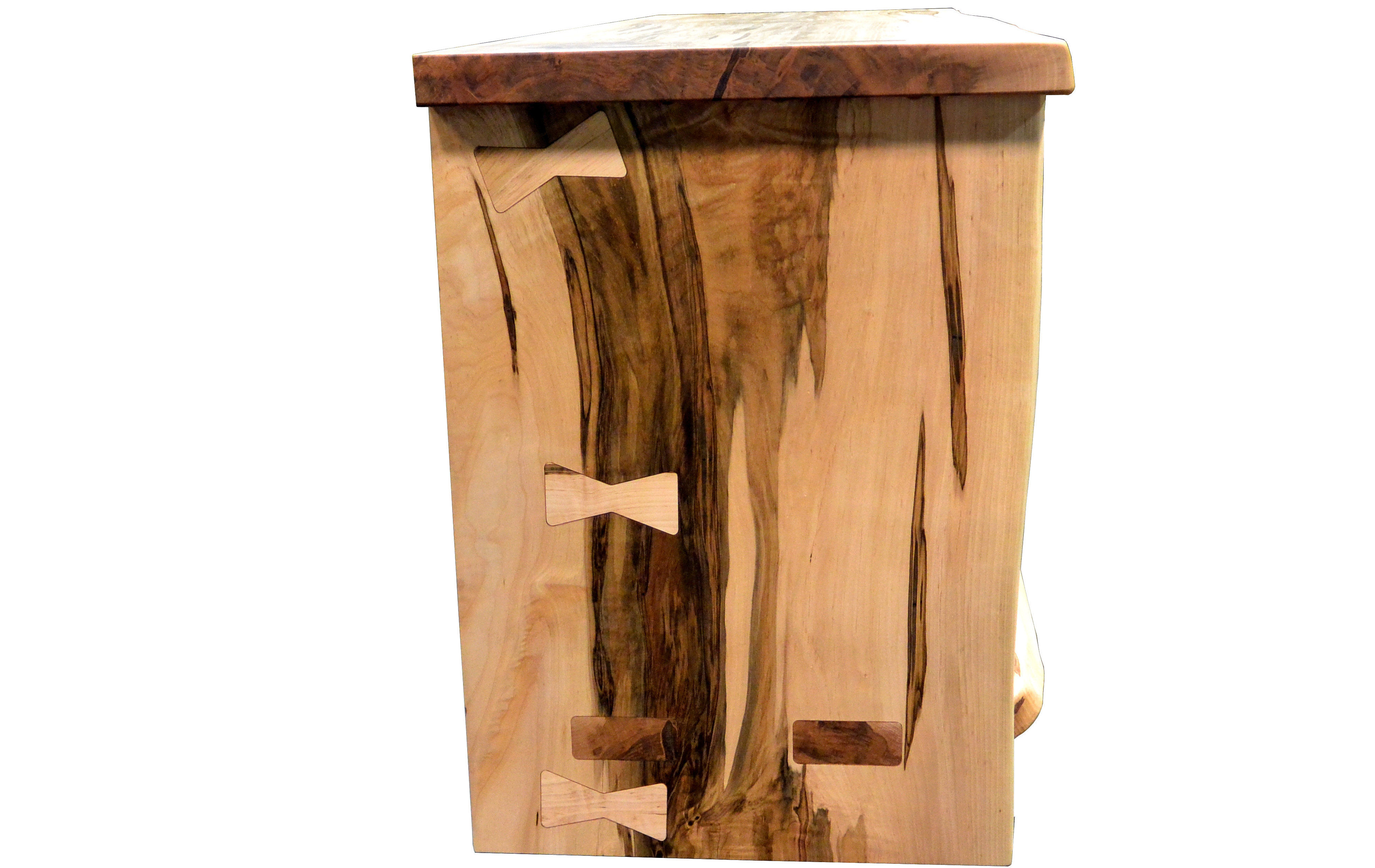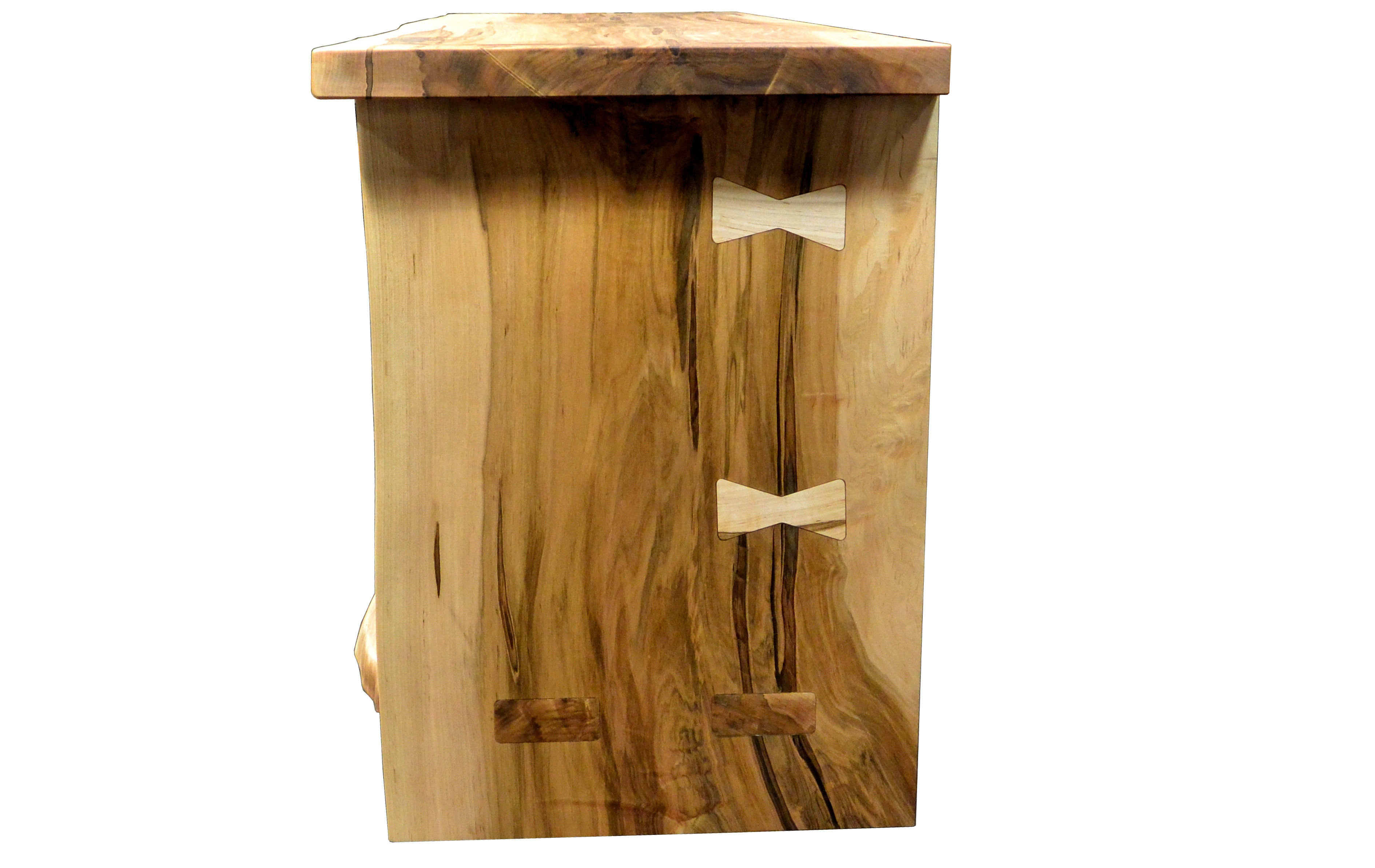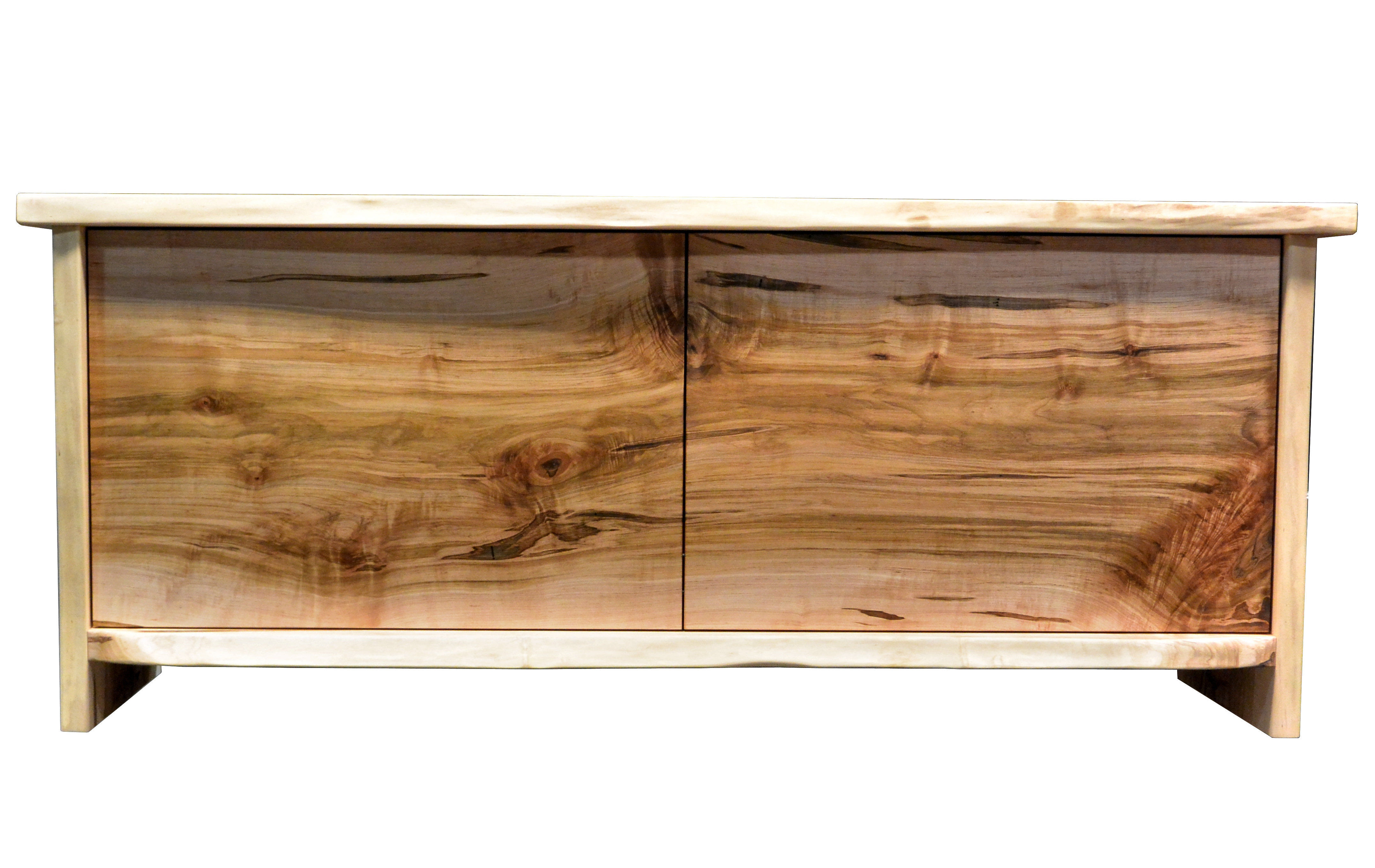 Custom Entertainment Center made from Ambrosia Maple Slabs. Natural Edges on Face. Mortise and Tenon Jointery. Maple Butterfly Detailing. Adjustable Shelves. Cord Cutouts. Tung Oil Citrus Finish.