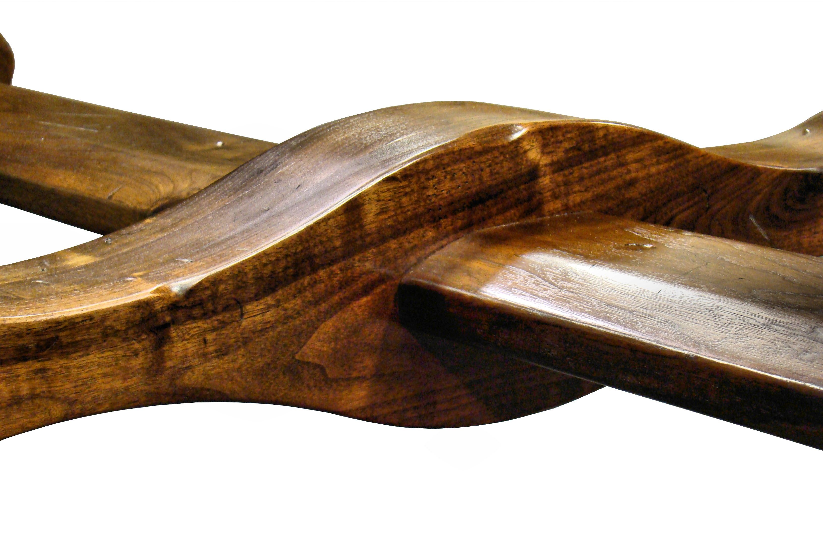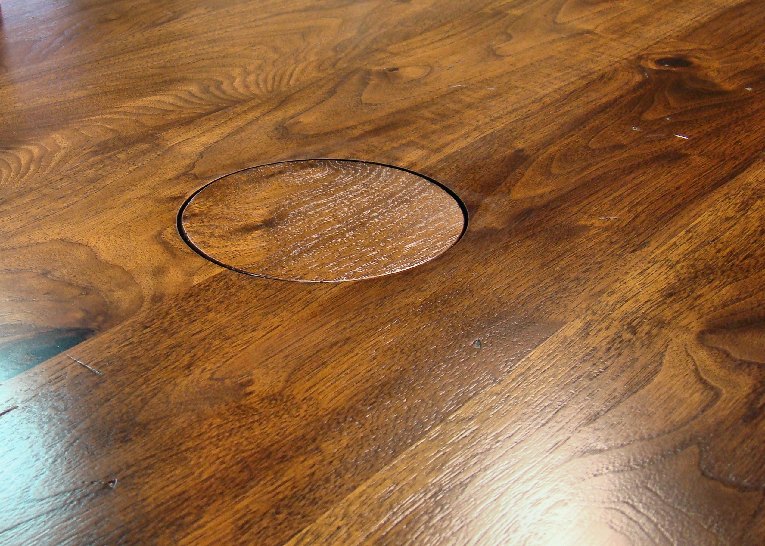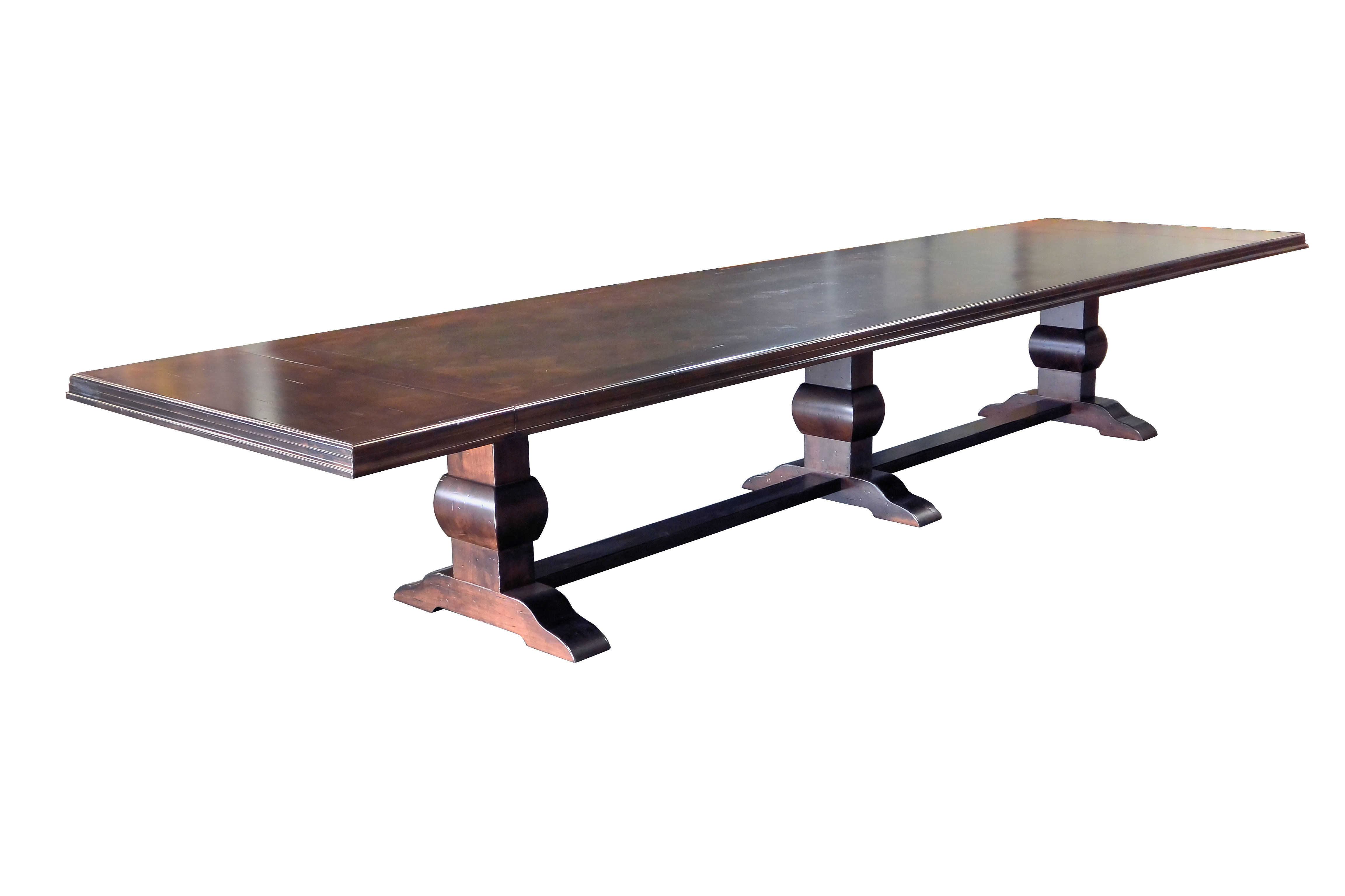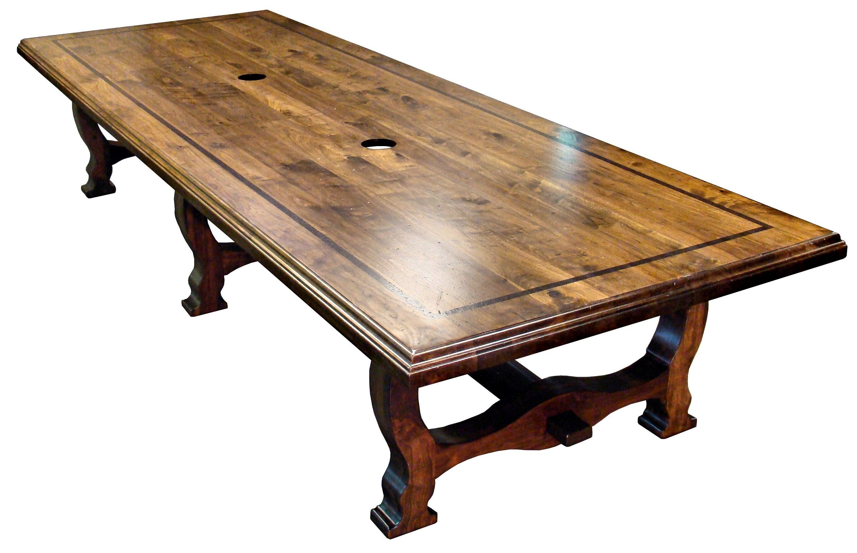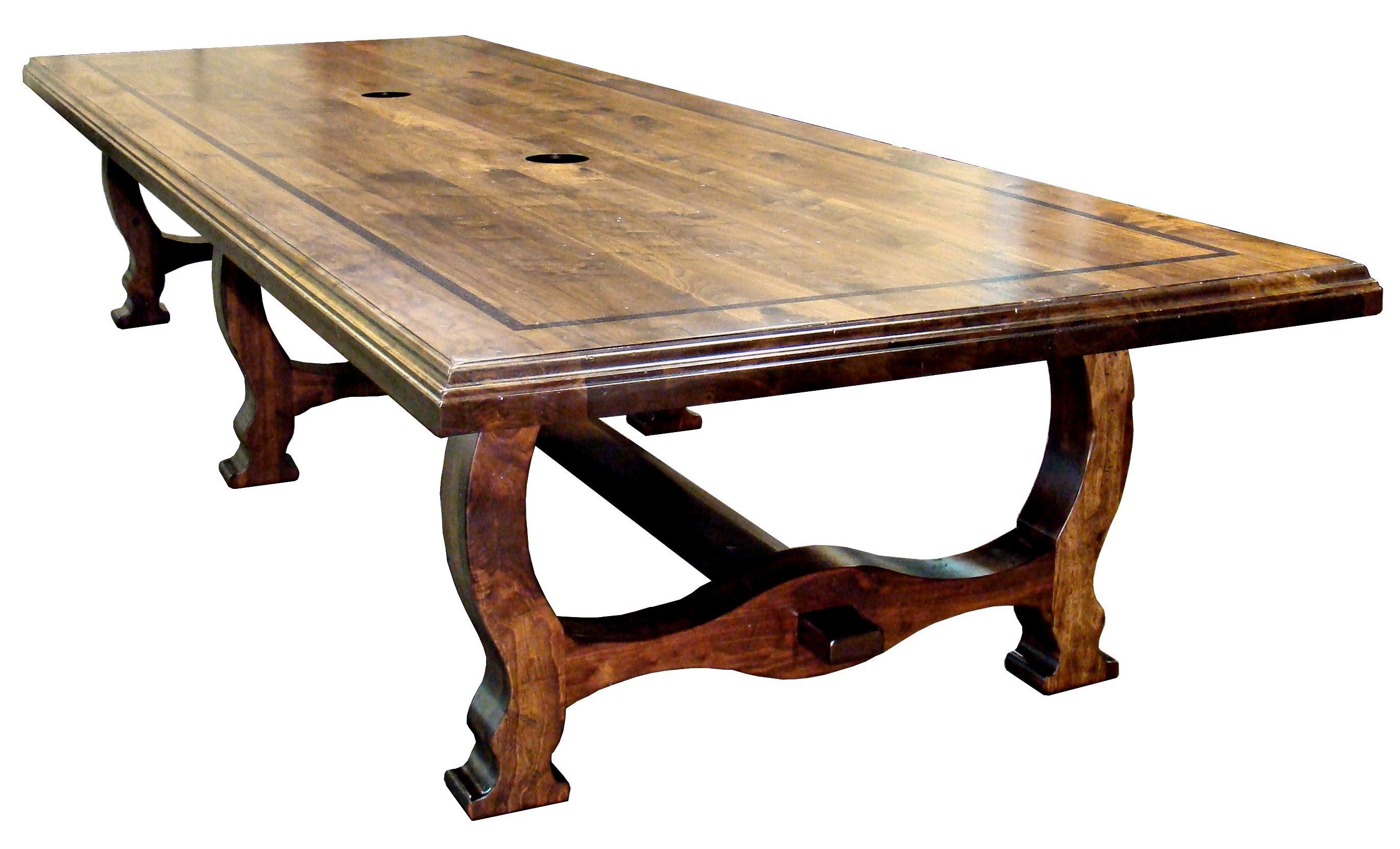 Distressed face grain Walnut trestle-style conference table with Wenge accents. Pop-up electrical grommet access. Through mortise and tenon jointery.