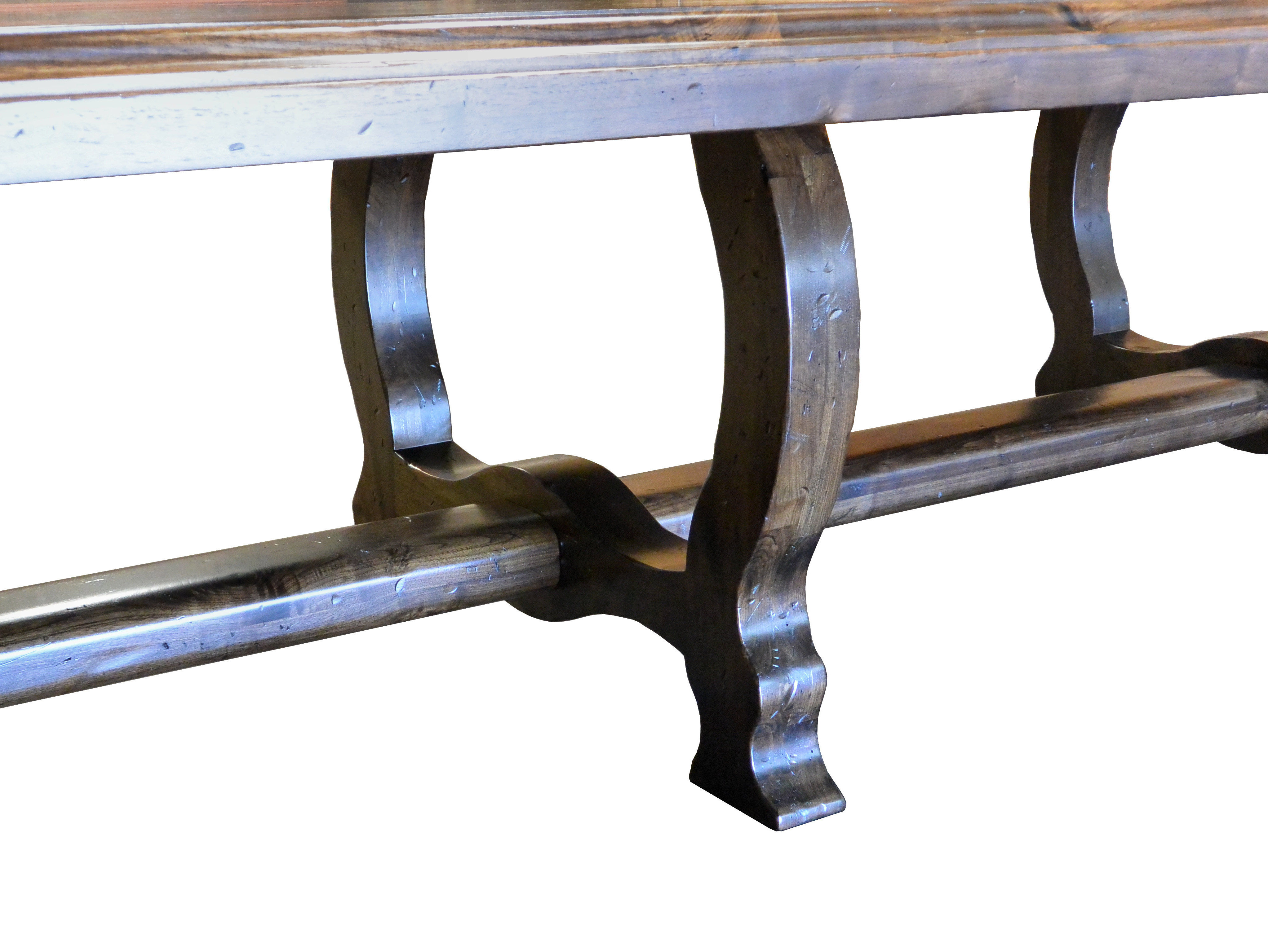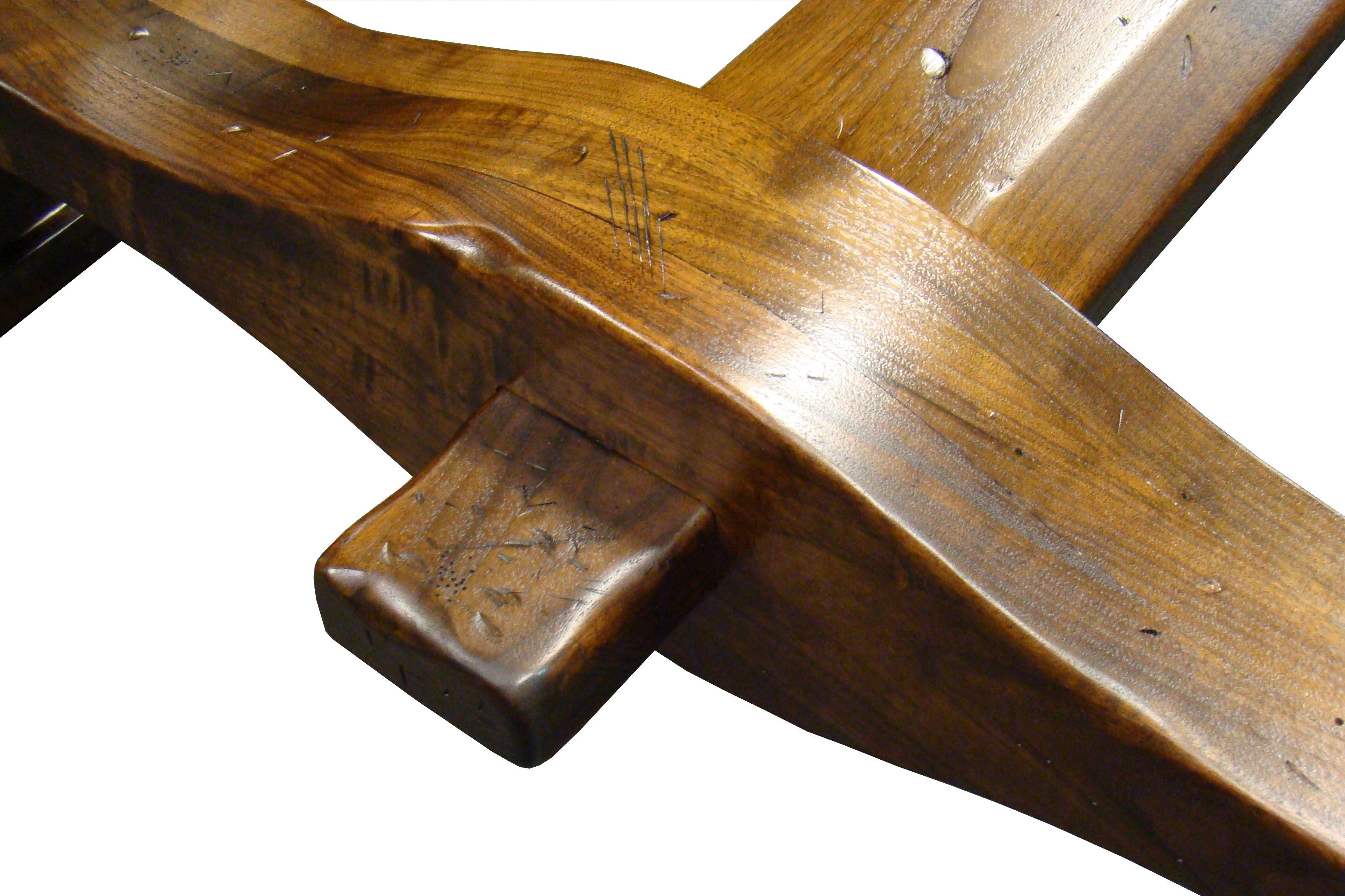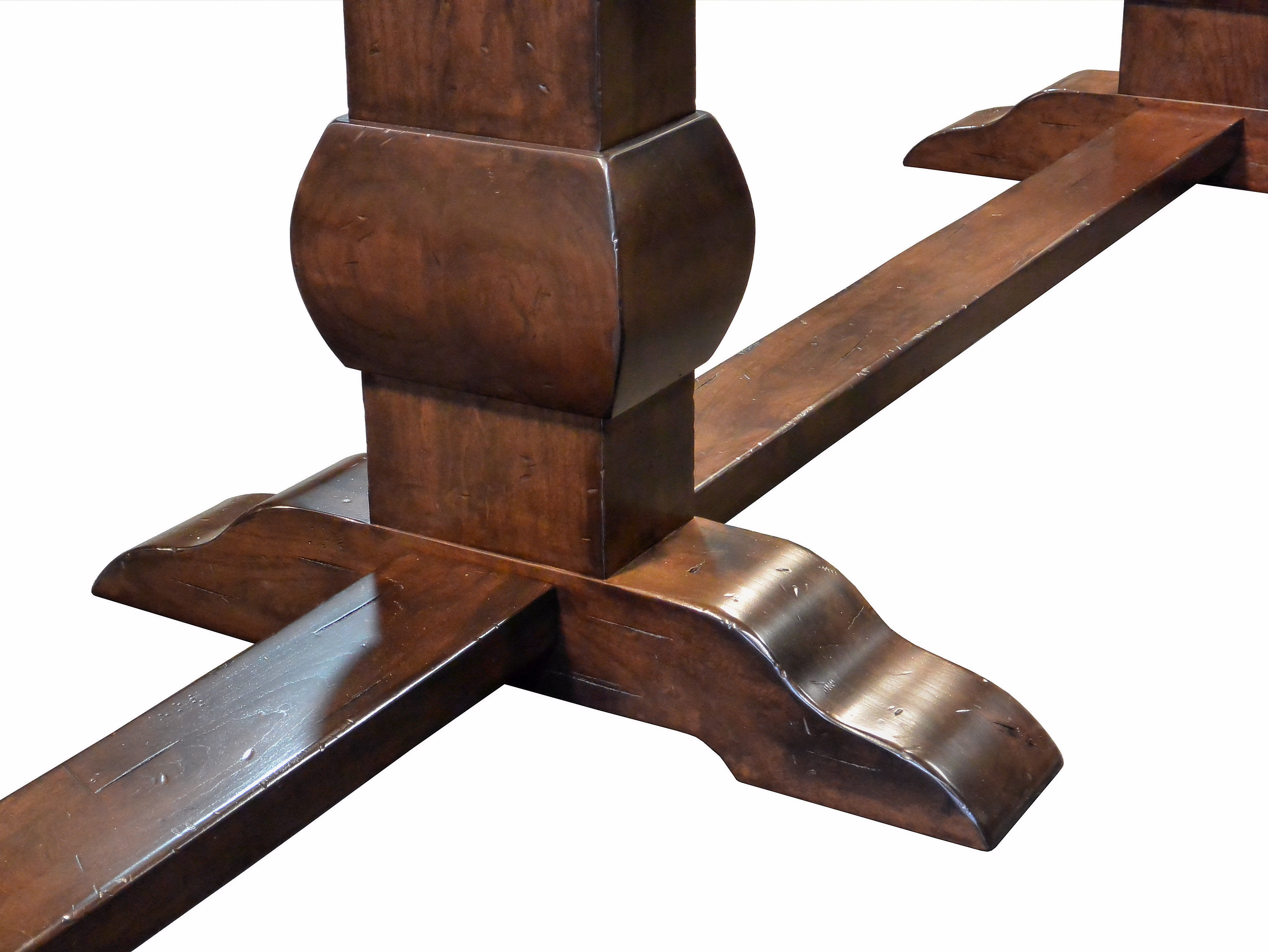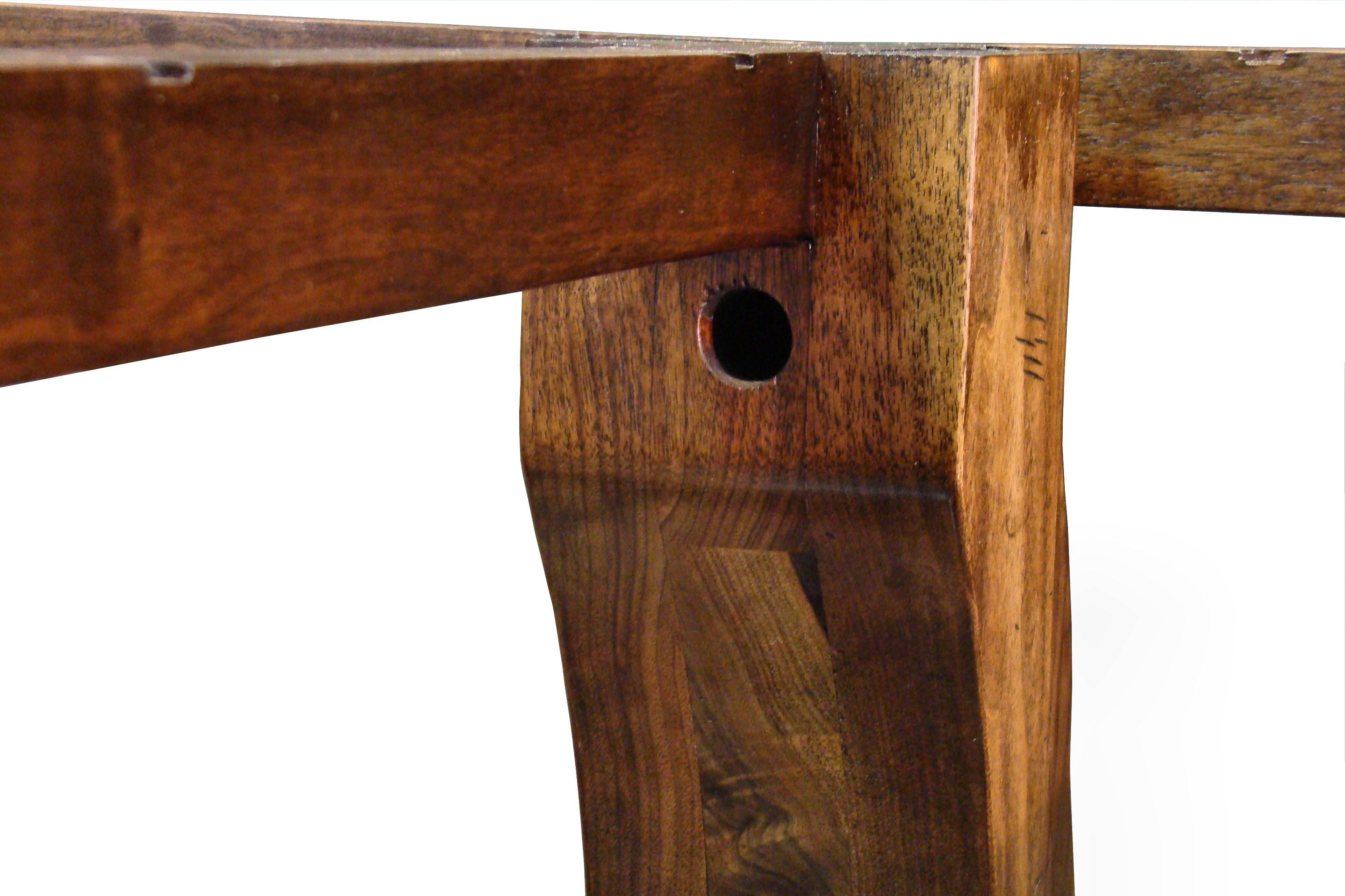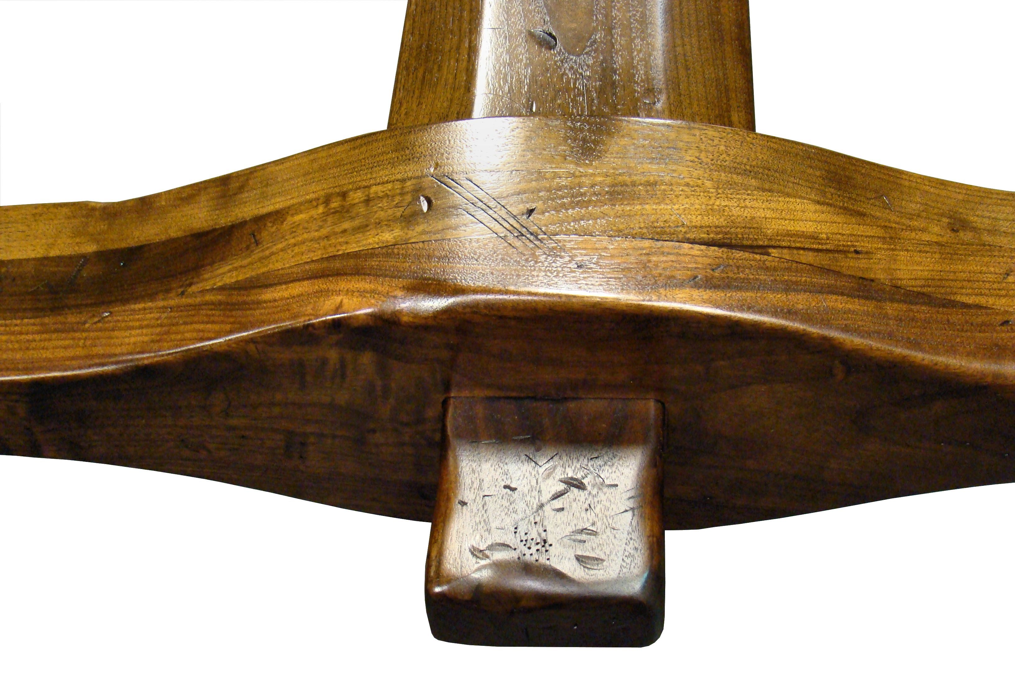 Distressed face grain Walnut trestle-style dining table with mortise and tenon jointery.