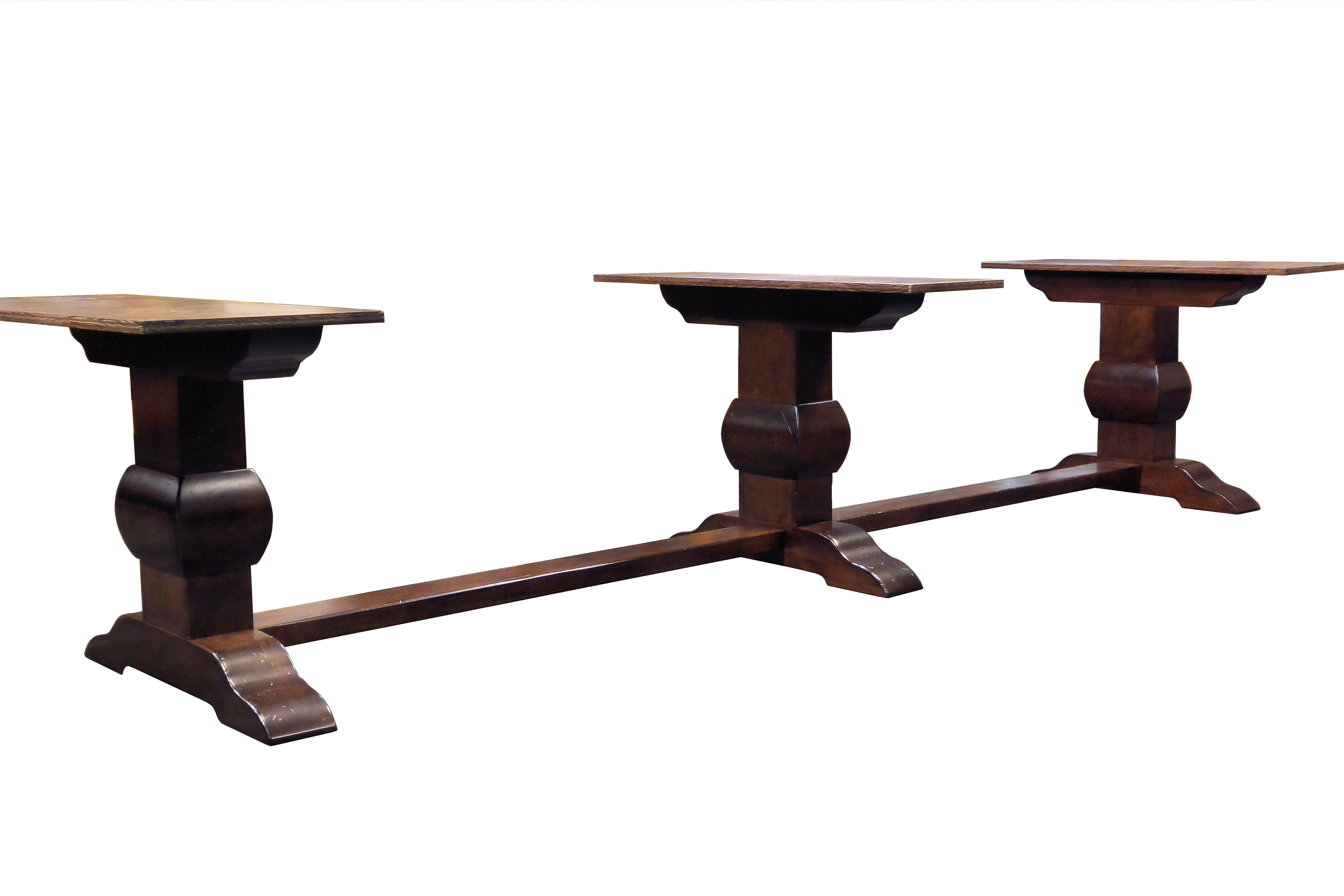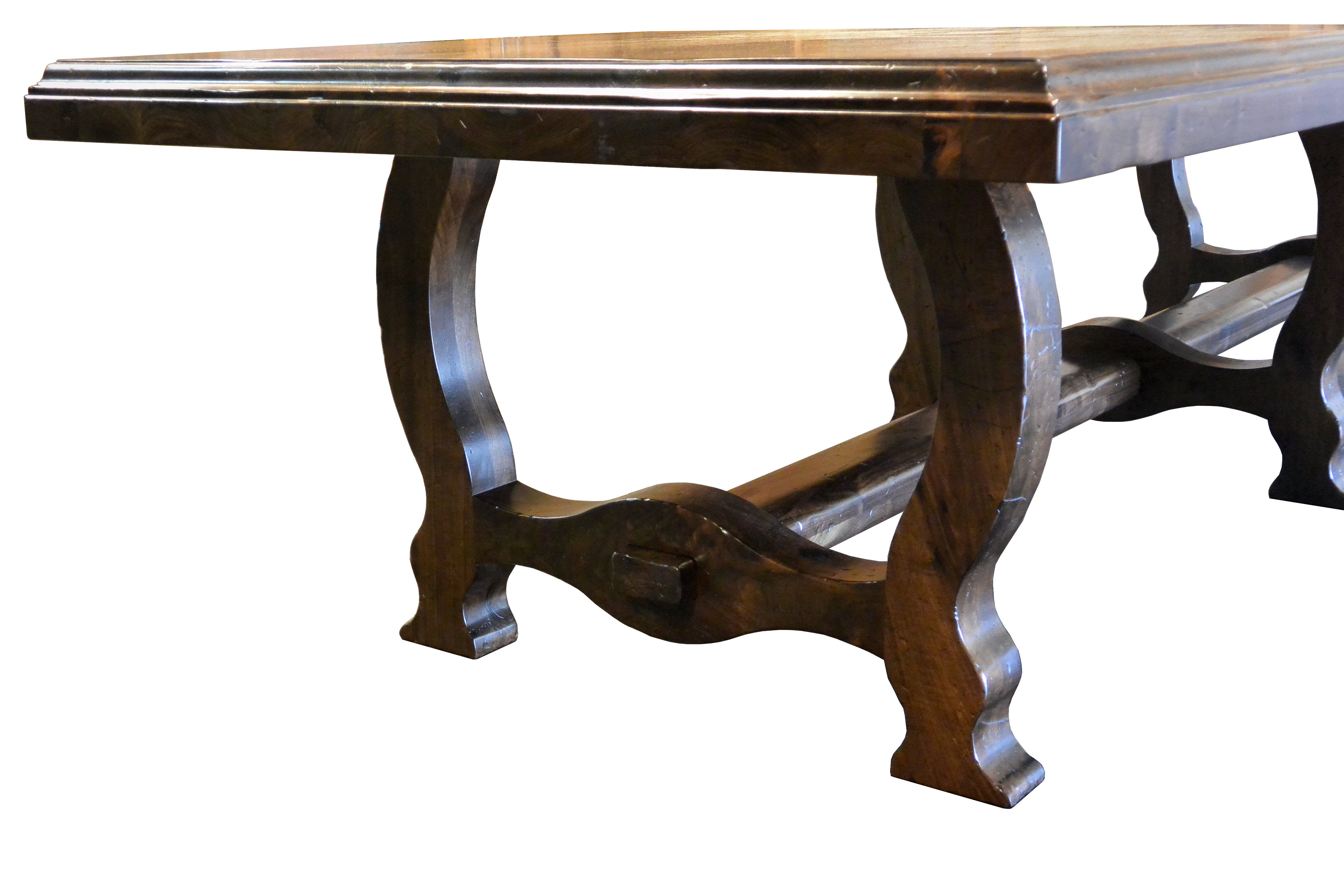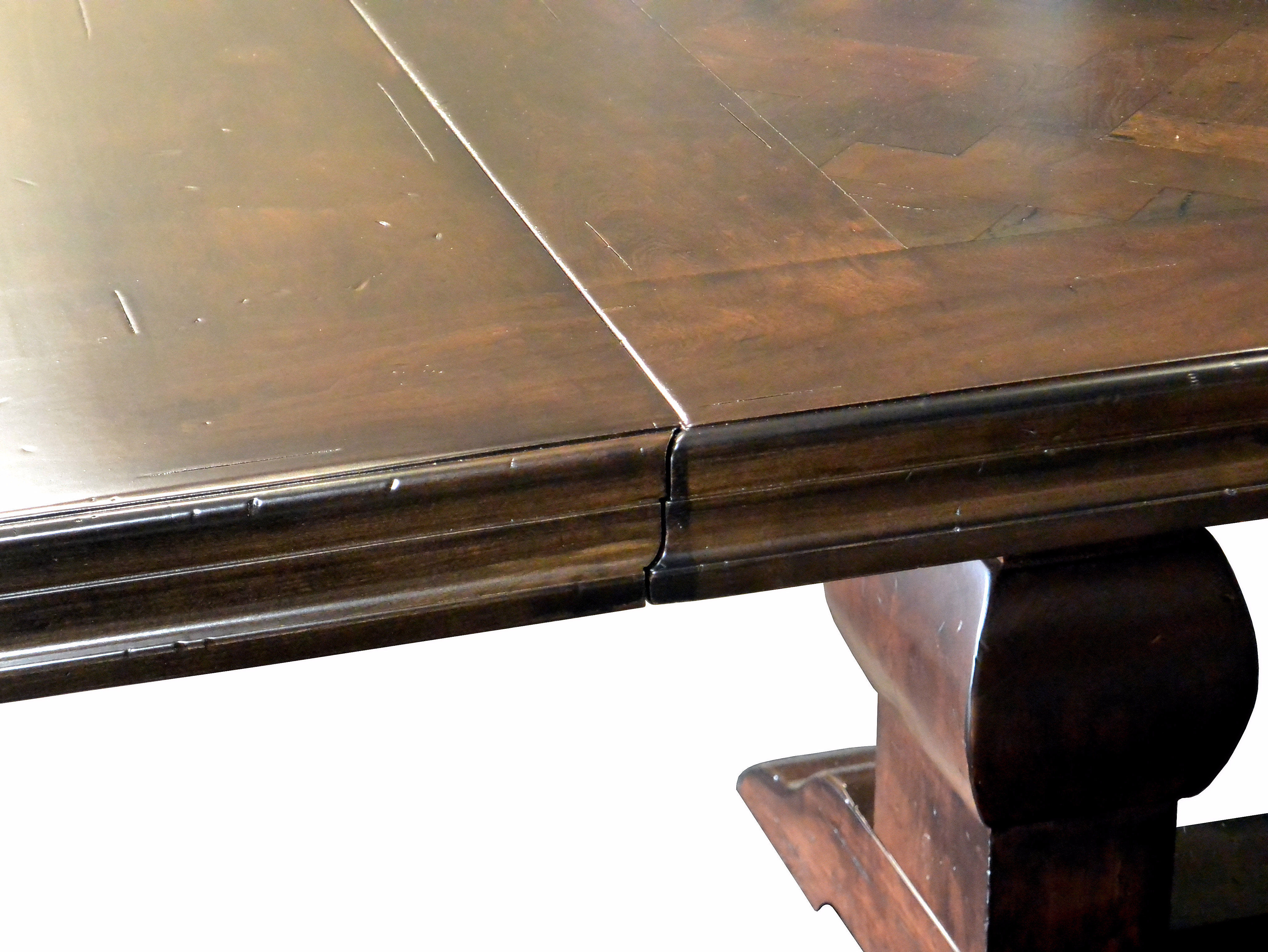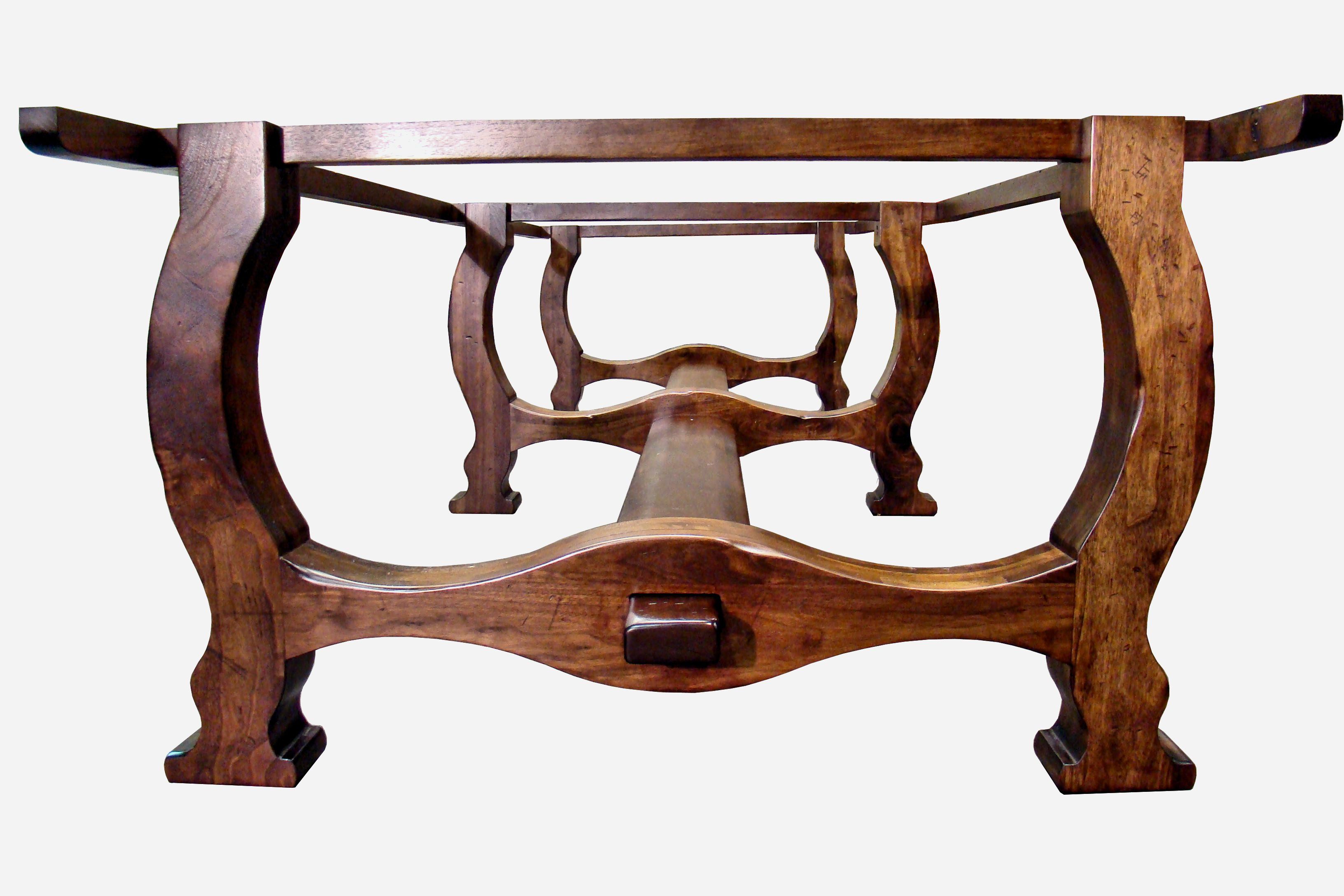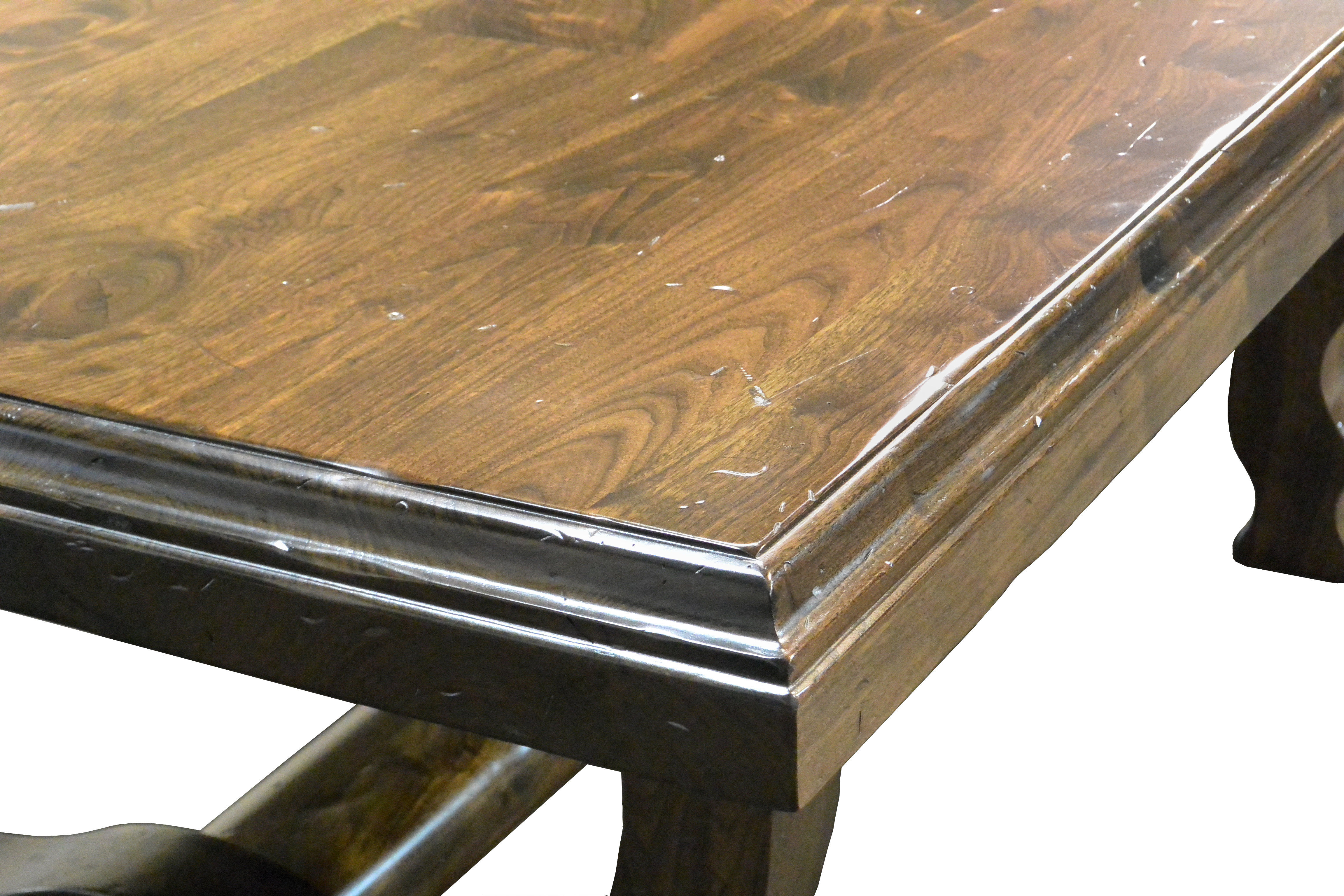 Distressed face grain Walnut trestle-style dining table with mortise and tenon jointery.