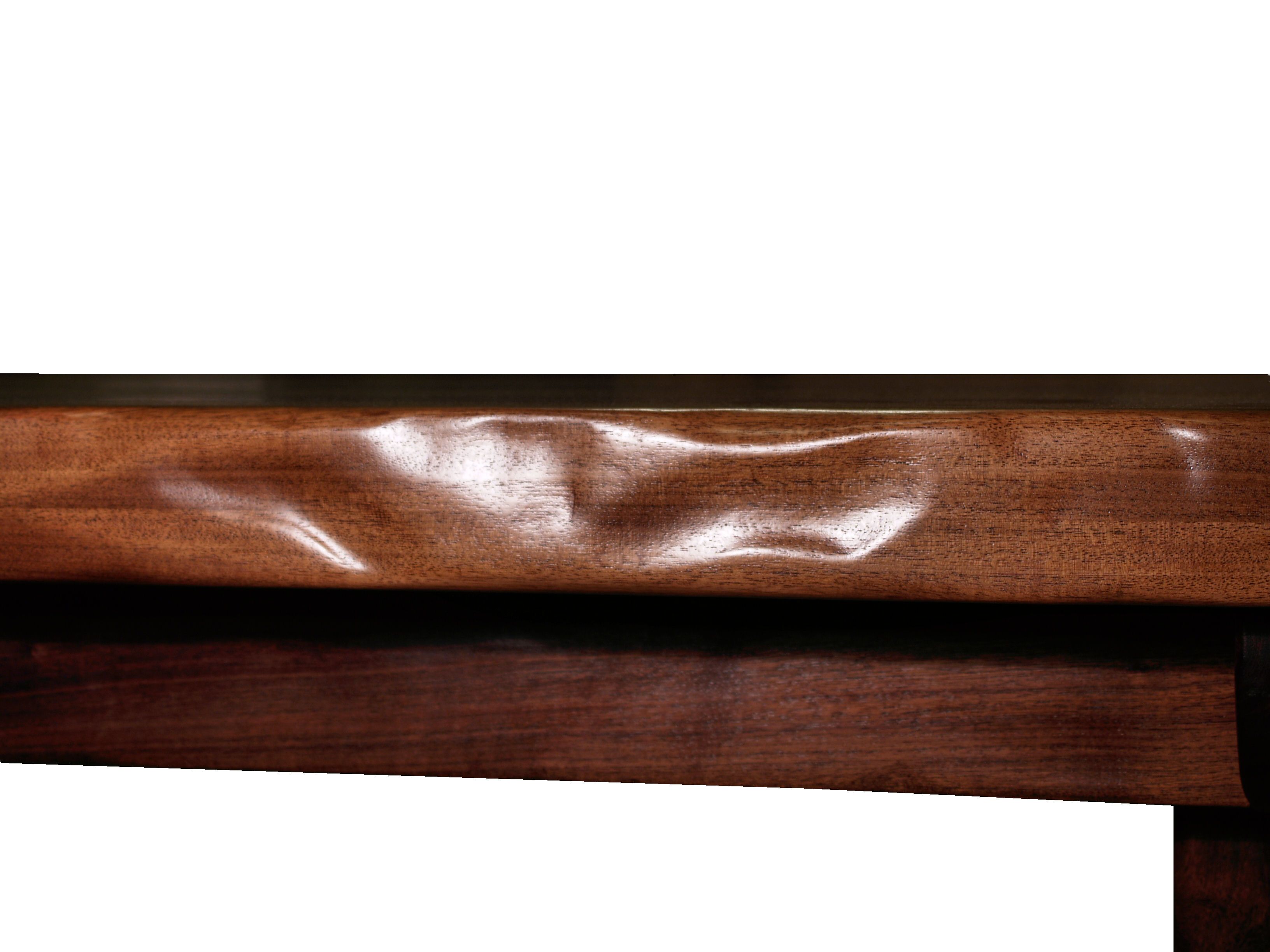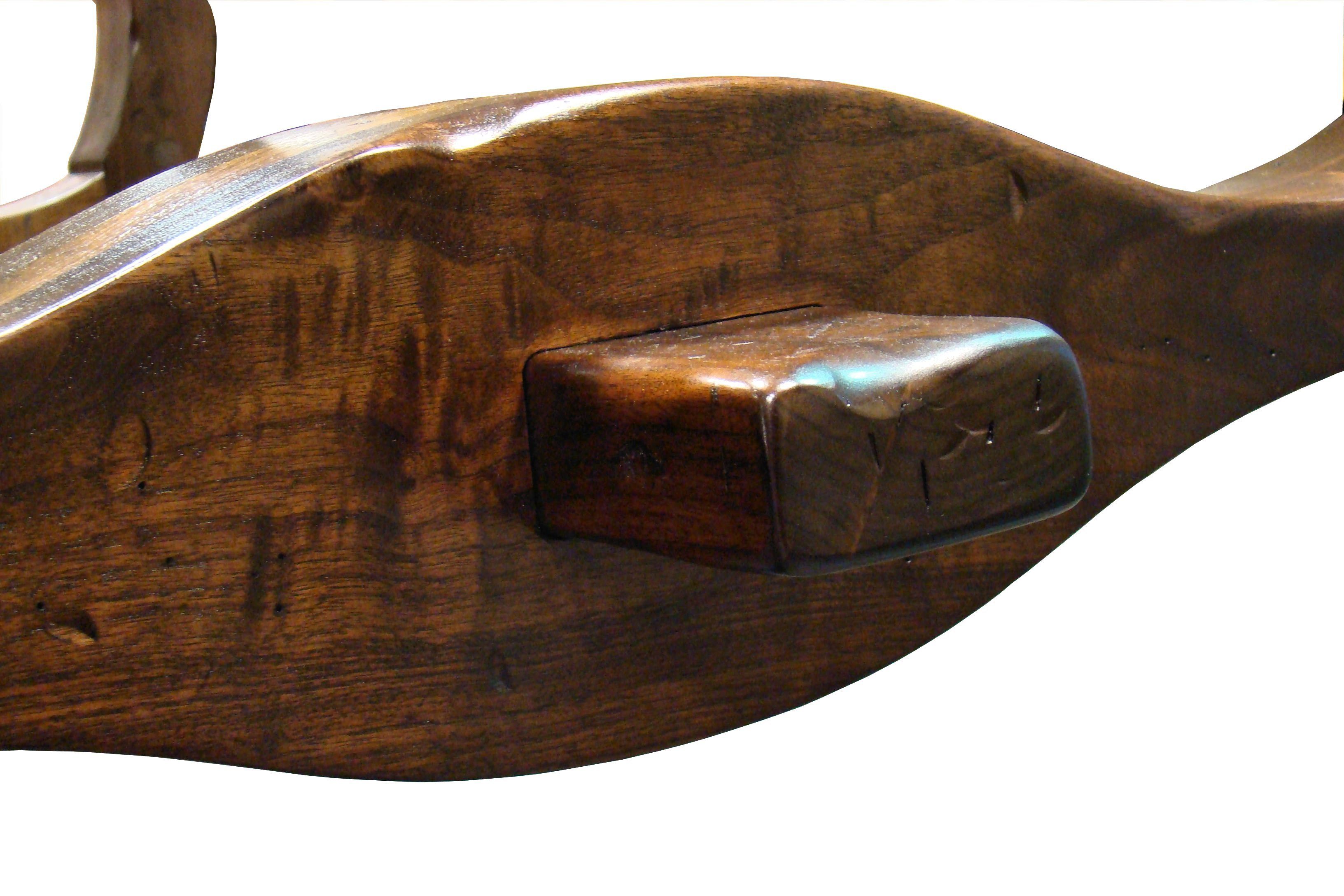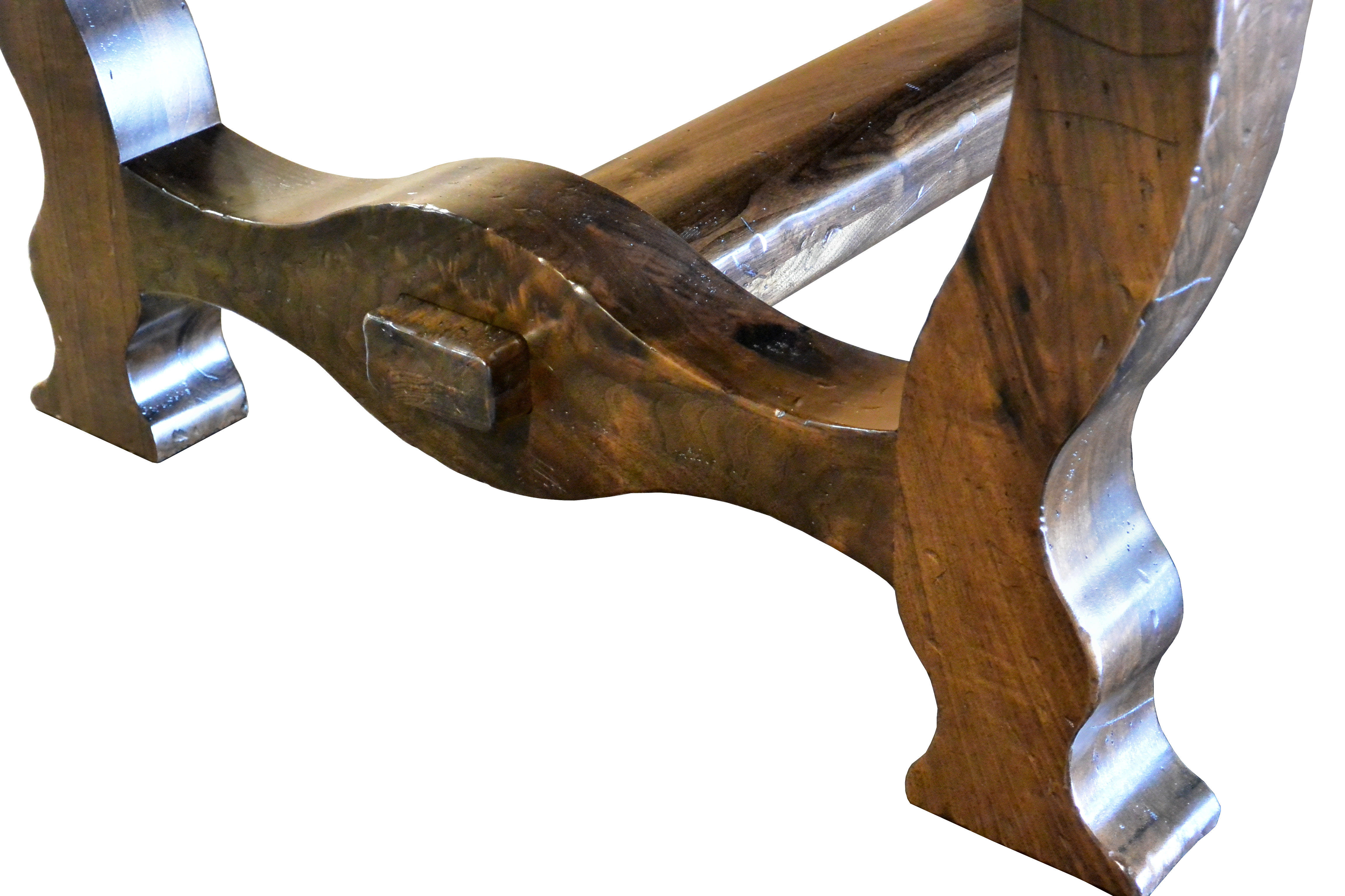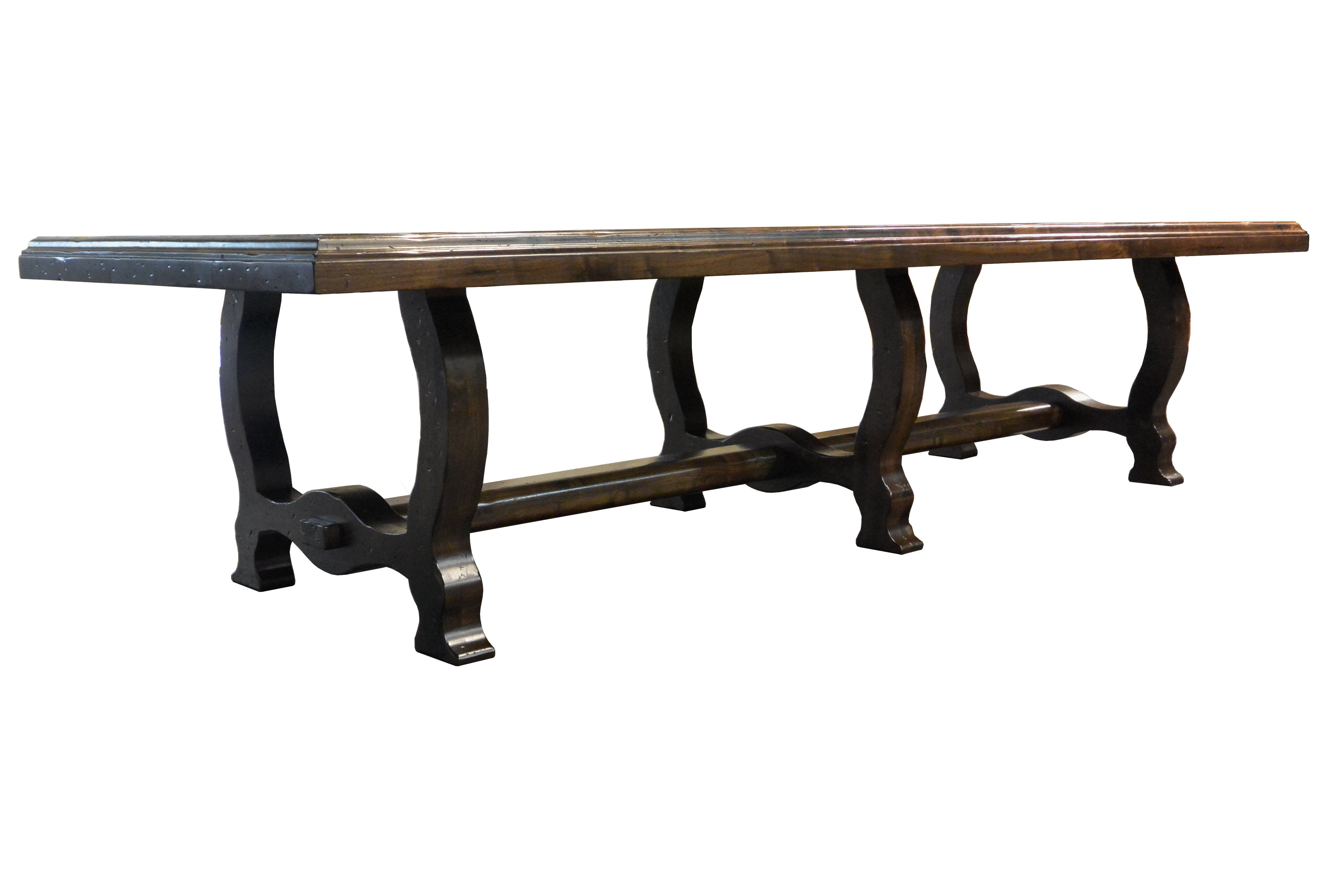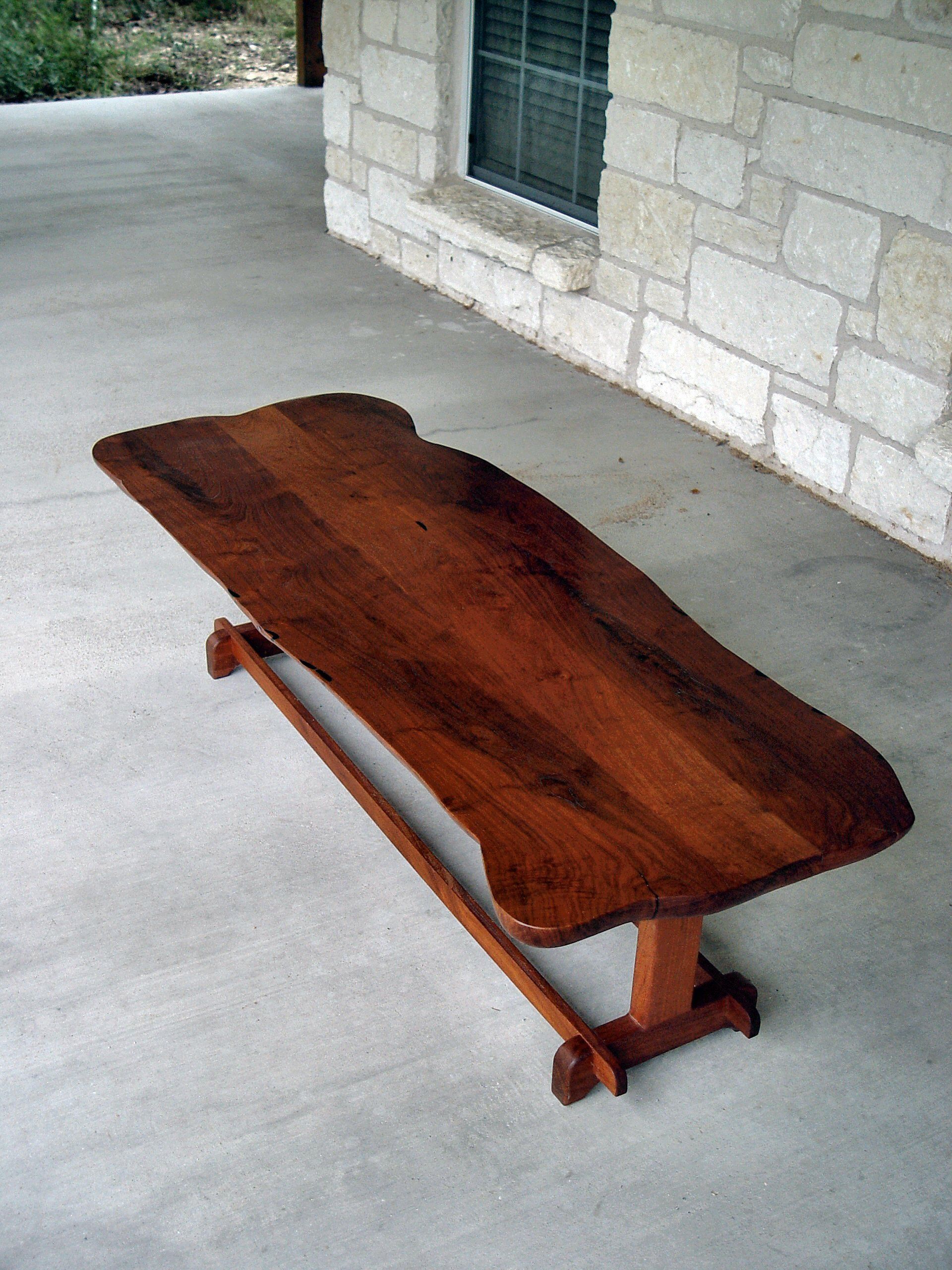 Custom face grain argentinean mesquite dining table. Rustic trestle-style construction with through mortise and tenon jointery and hand carved edges.