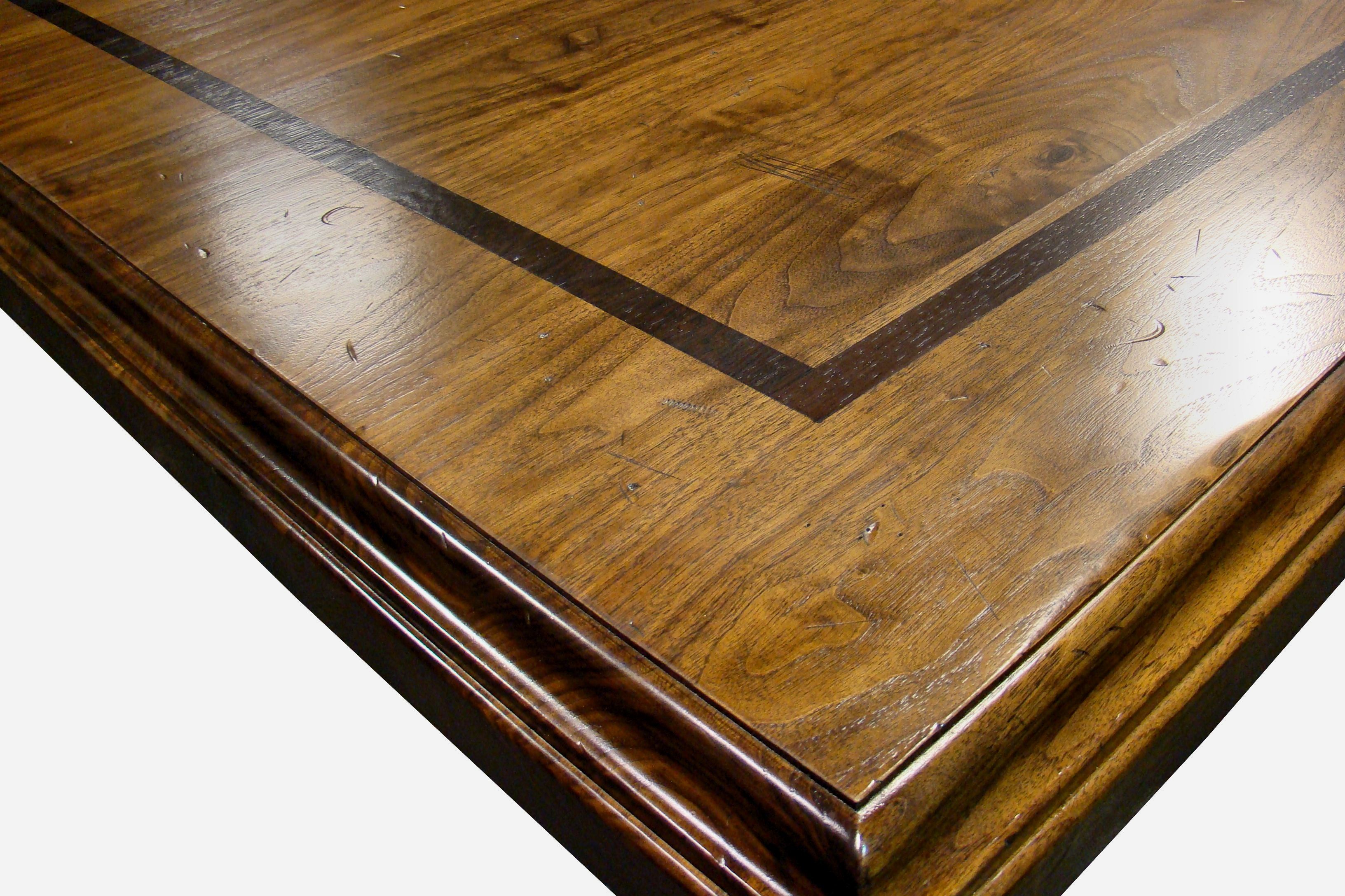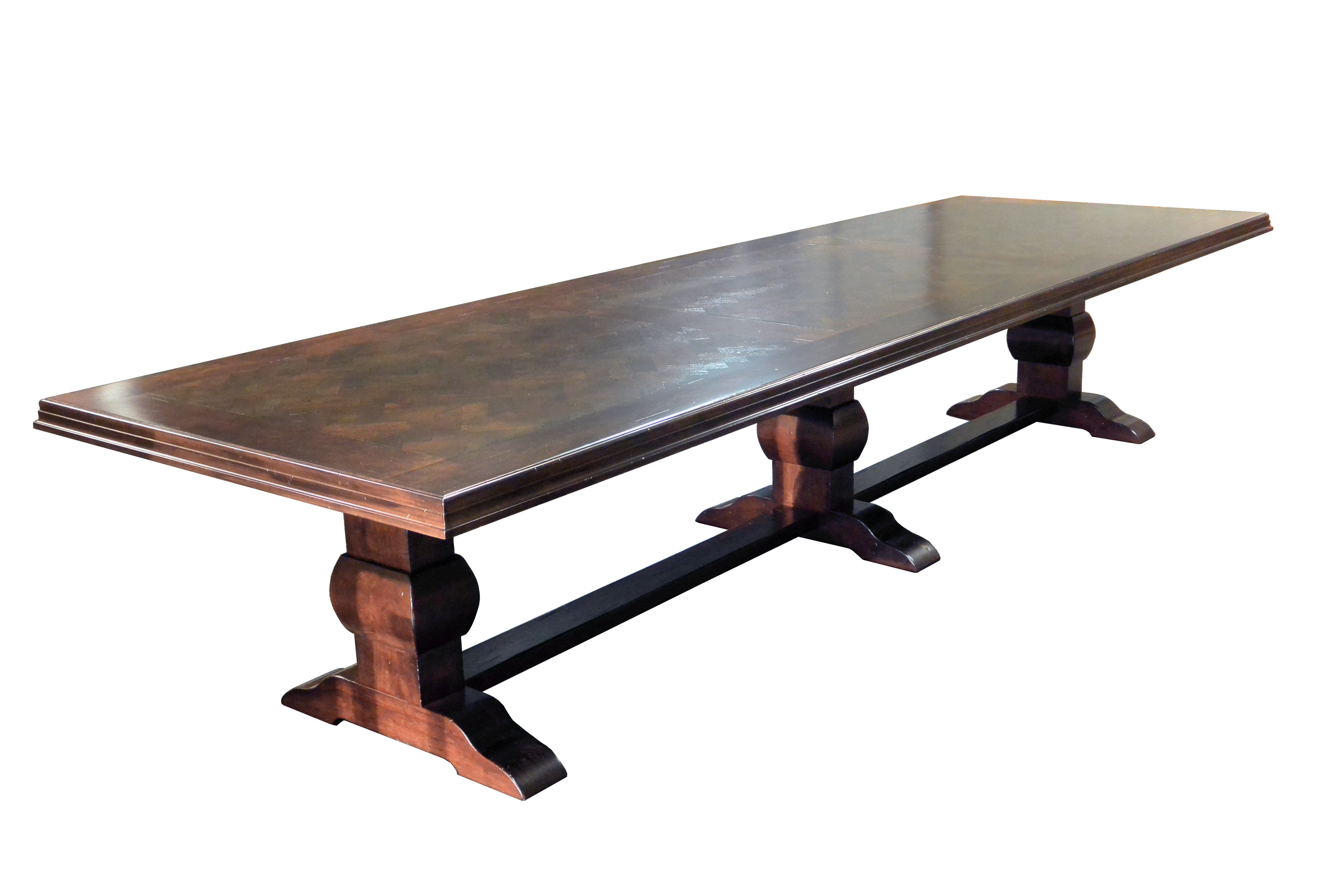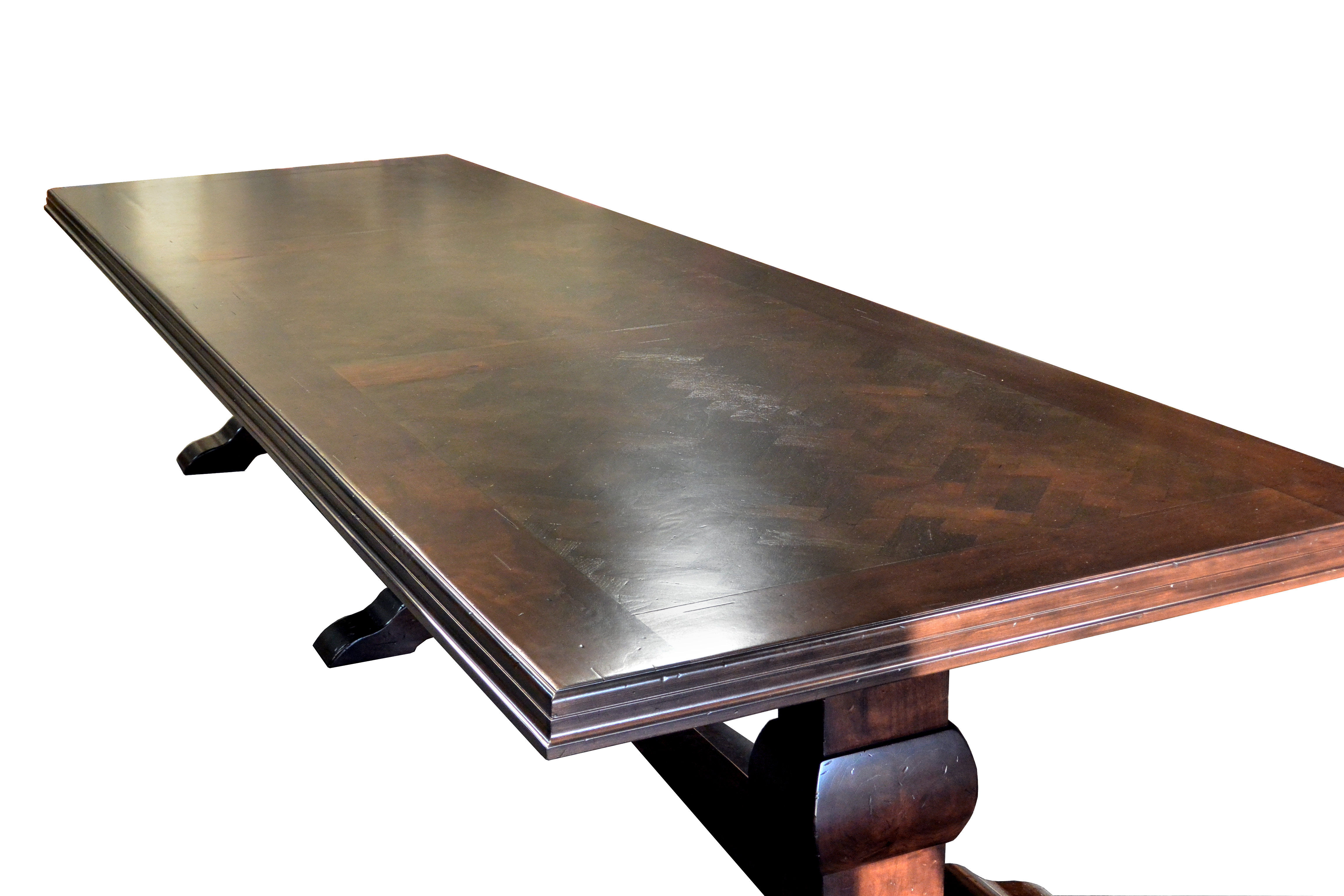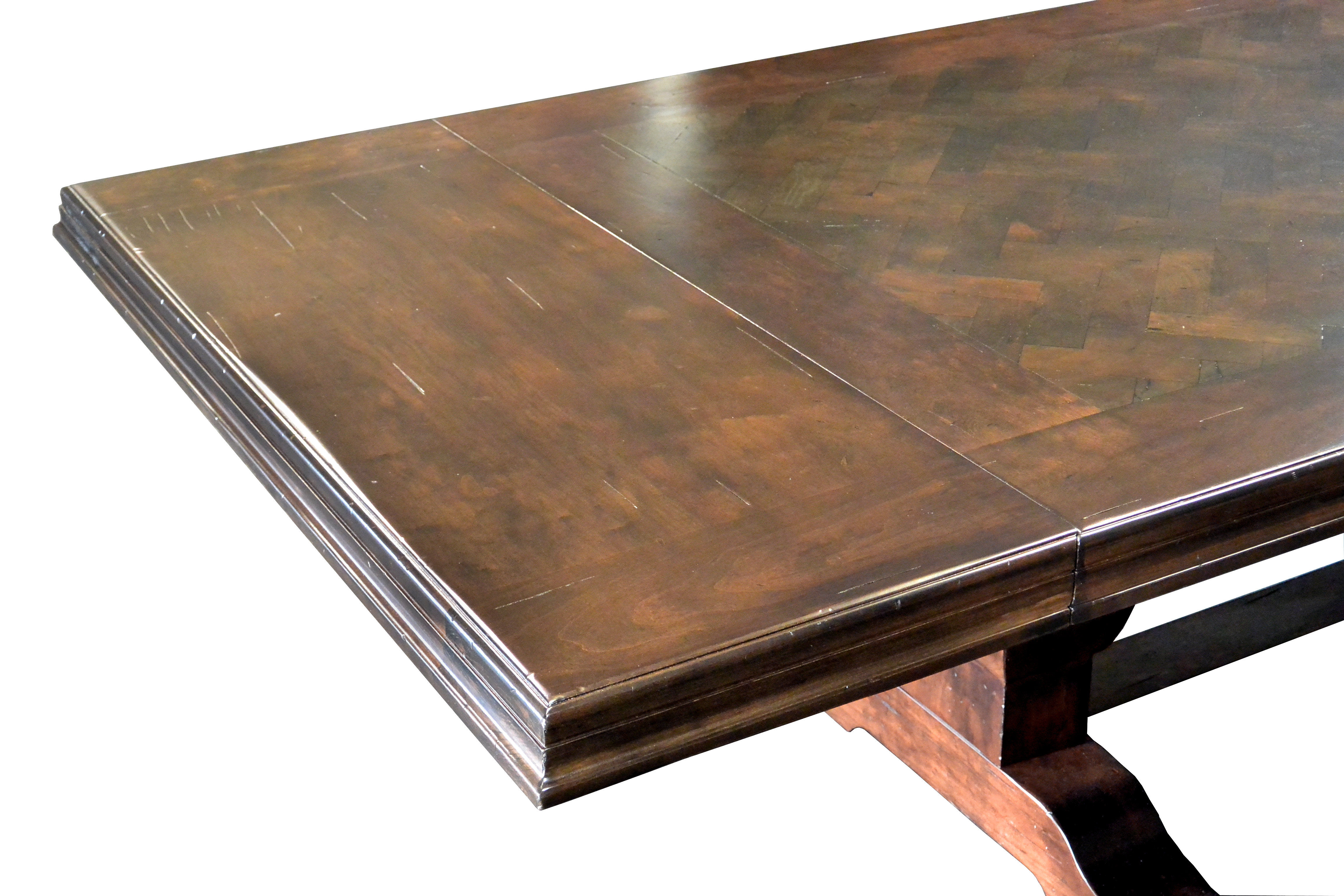 Distressed herringbone mesquite trestle-style dining table with Walnut banding and Walnut leaves. Through mortise and tenon jointery. Custom Stain.
