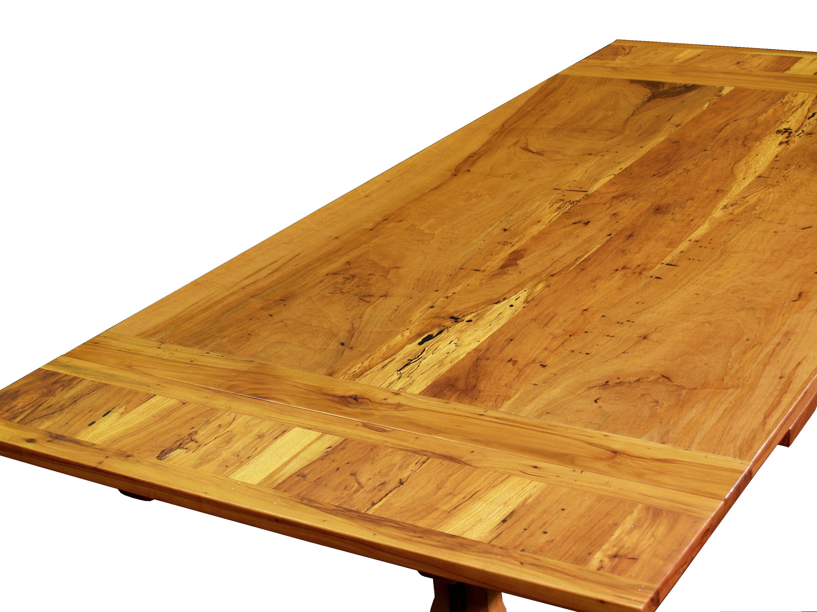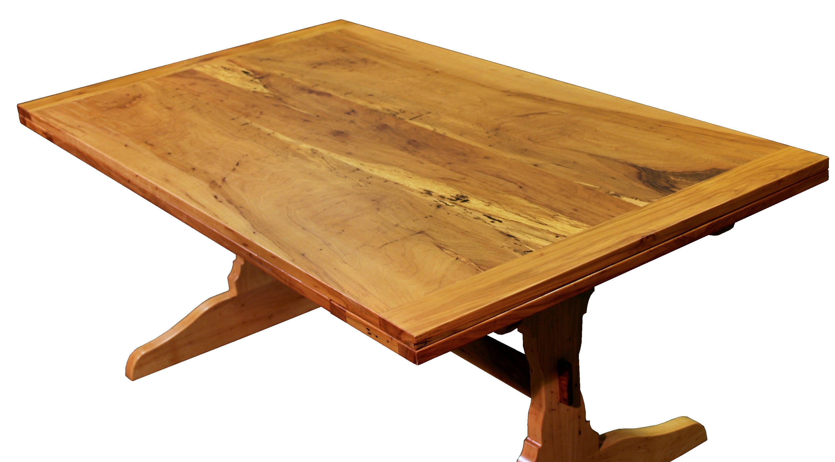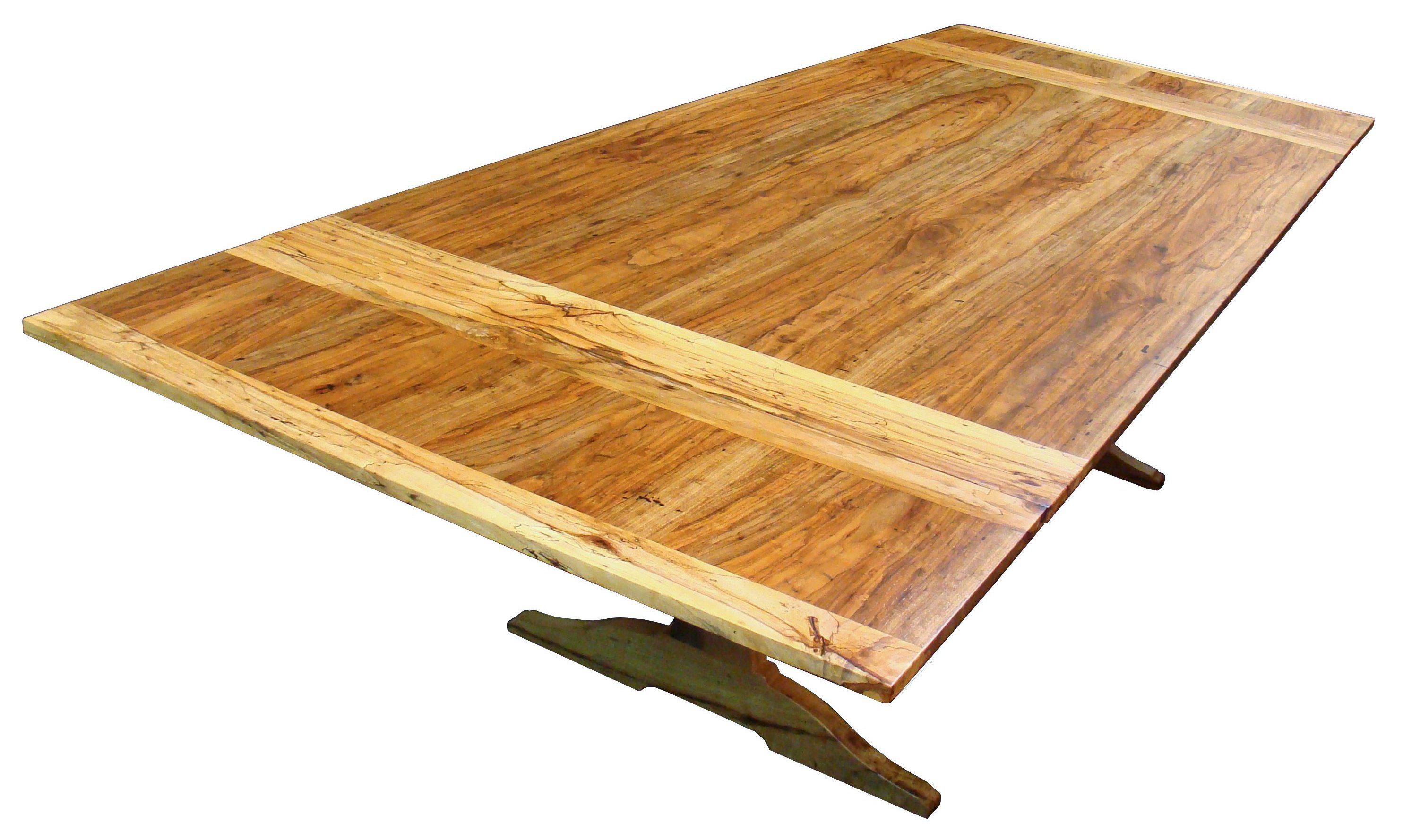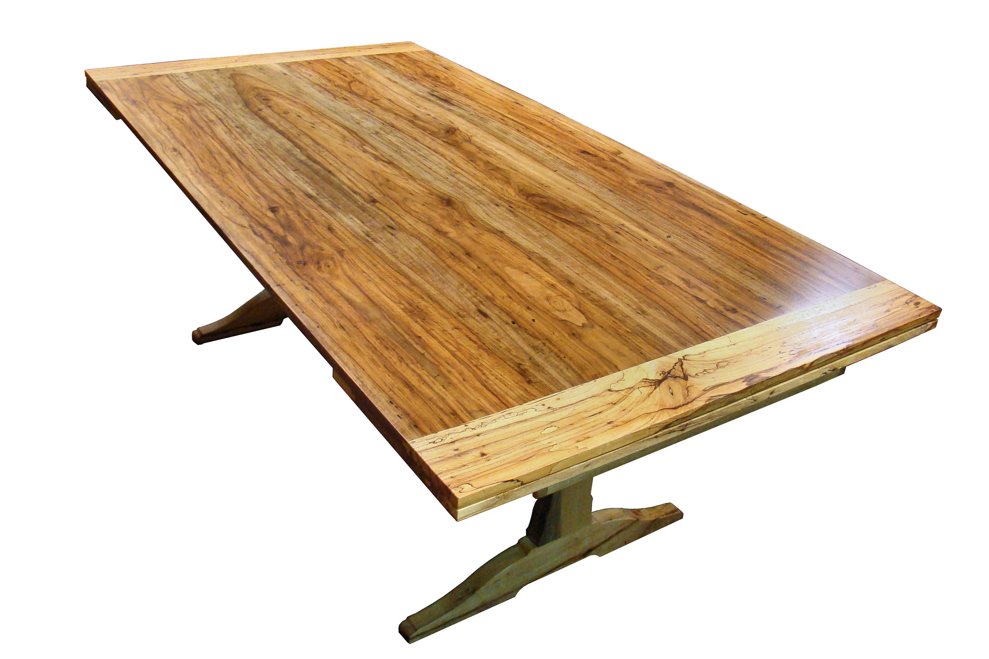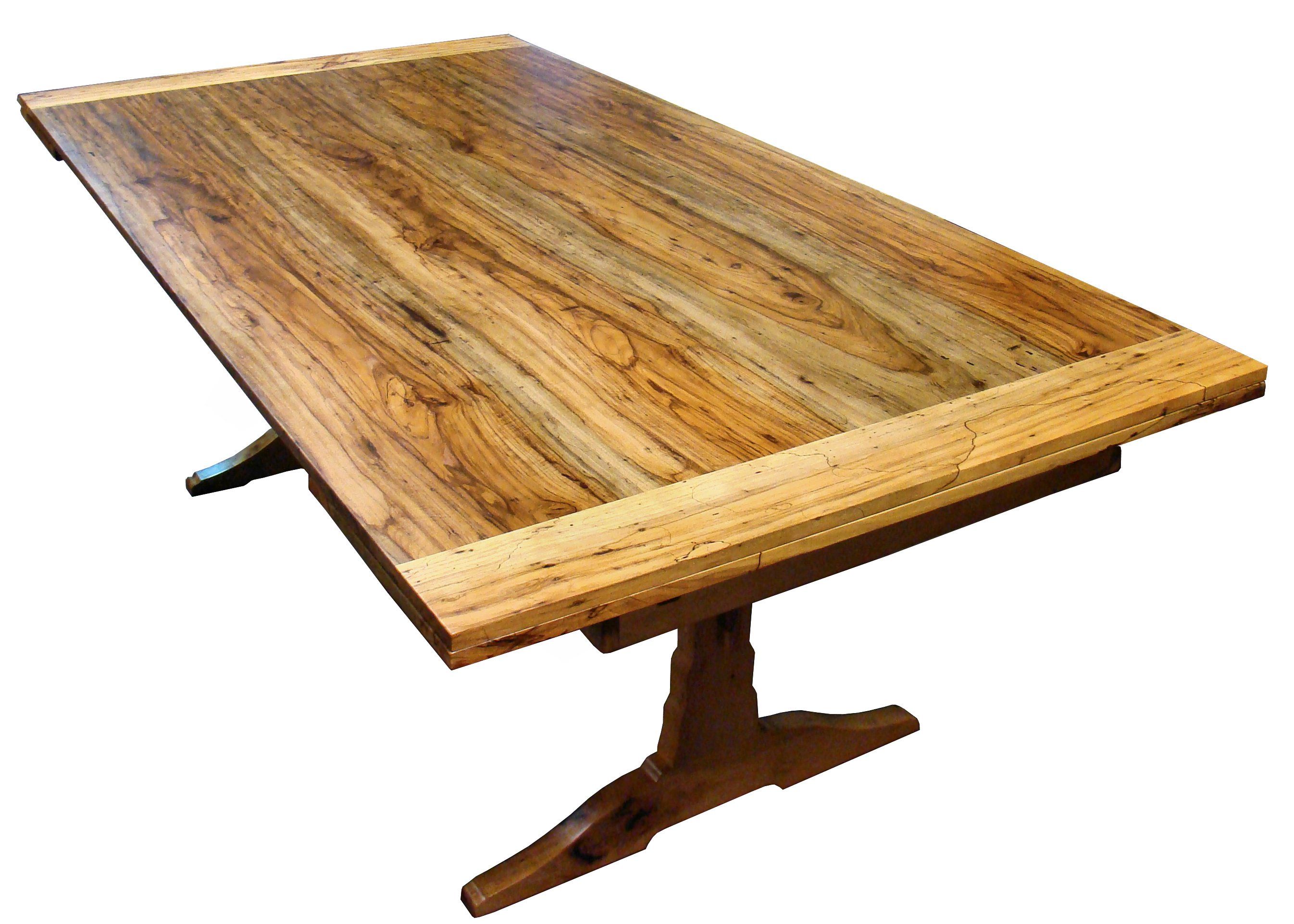 Custom spalted pecan trestle-style table with self storing leaves. Face grain construction with bread board ends.