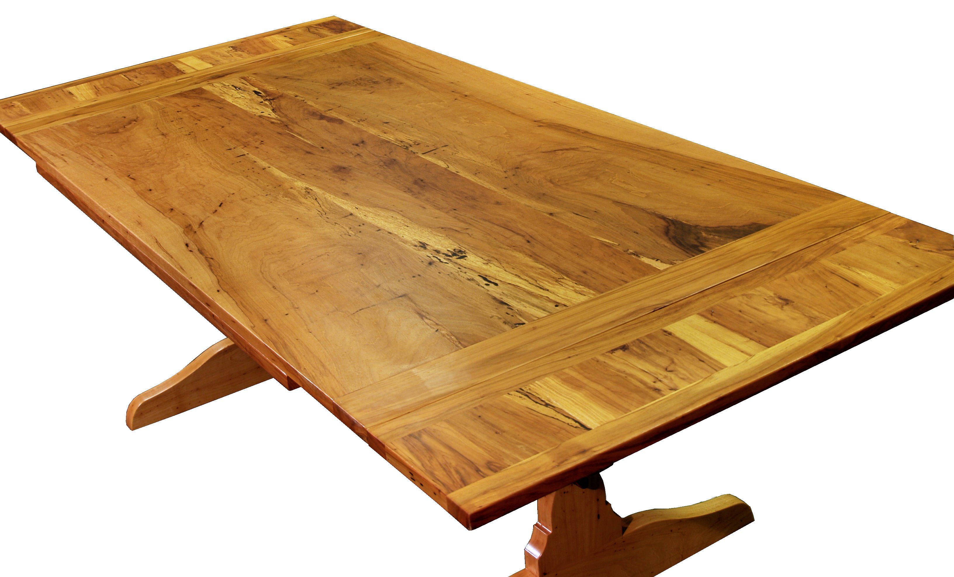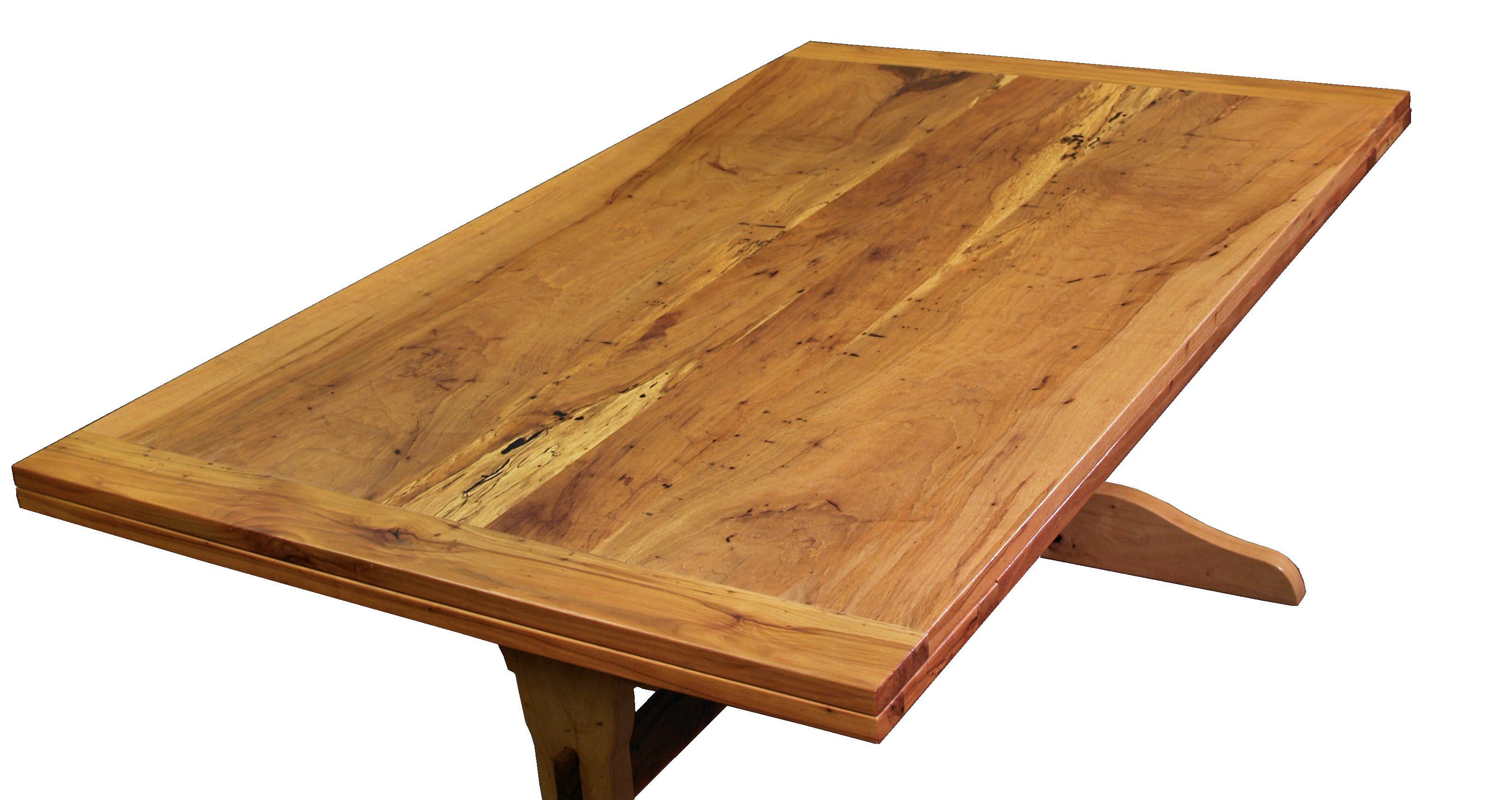 Custom trestle style dining table with self-storing leaves. Made from spalted pecan with bread board ends and mortise and tenon jointery.